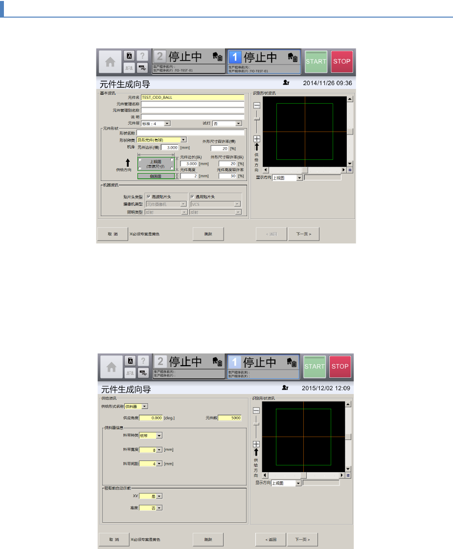 第 4 章 操作篇 4- 14. 数据制作步骤 344 4- 14 - 8. 制作异形元件(有球) 的资料 1 打开[元件生成向导 ]画面 后,输入元件名。 2 从[形状种类]的 下拉列表 中,选择异形元件( 有球 )。 3 选择元件贴片中使用的 [ 贴 片头类型 ] 。 有些尺寸的元件 ,因选择的贴片头,有时不 能生成元件数据。 4 触摸 [ 下一页 ] 。 显示 [供给资讯]画面。 5 从下拉列表中分别选择 [ 供 给形式名称 ] …