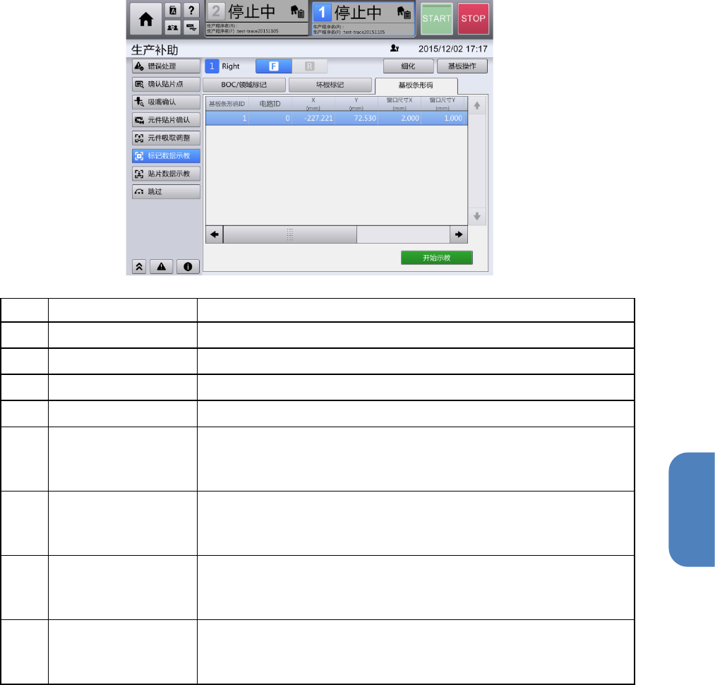 第 4 章 操作篇 4- 15. 示教 370 4- 15 - 3. 标记数据示教 测量 生产程序的贴片 资料 中设定的 BO C / 领域标记、坏板 标记、以及基板条形码在基 板上的位置,在作为 OCC 目标 位置进行修正的示教作业 中,可确认并细化显示测量 对象标记数据,设置测量用 的基板。 触摸 [ 生产补助 ] 菜单中的 [ 标记 数据 示教 ] , 显示 [ 标记 数据 示教 ] 画面。 [ 标记数据 示教 ] 画面, 在用户…