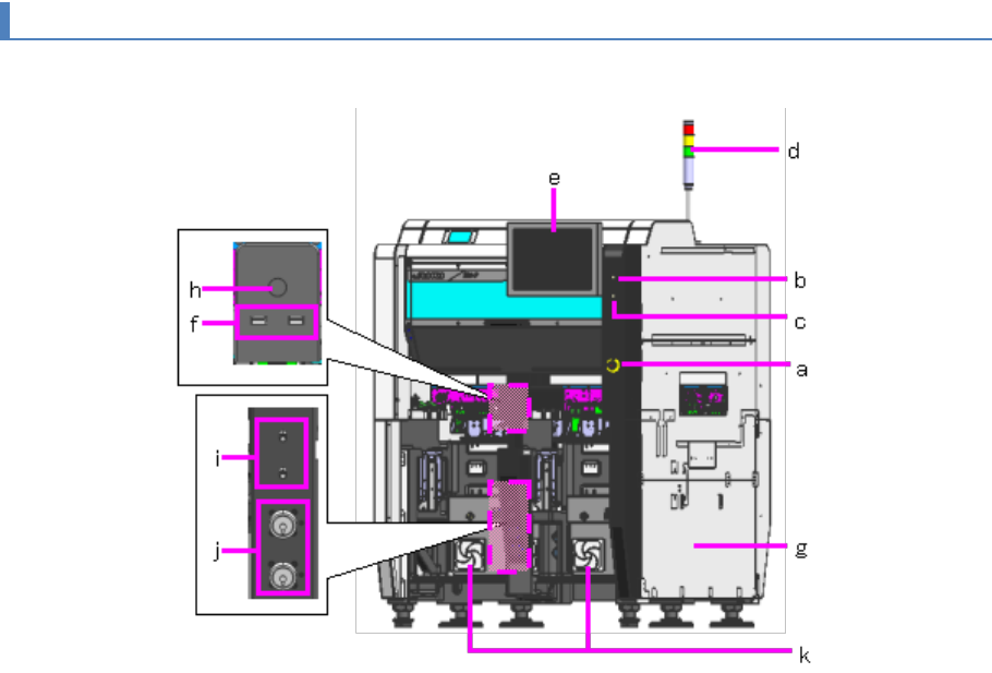 第 2 章 系统概要 2- 4. 机器的构成 13 2 RX-7 后部 (a) 主断路器 (b) Hour Met er (c) JOIN T IN (d) JOIN T OUT (e) LAN 端口 (f ) St art I nter Lock