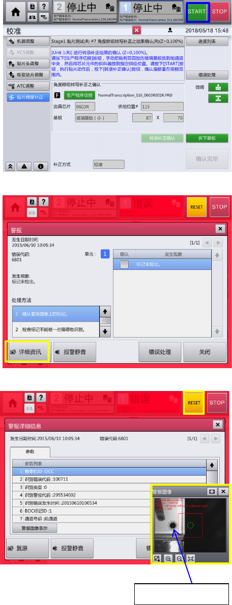 第 4 章 操作篇 4- 16. 校准 427 4 5- 5. 执行贴片精度测 量 所有元件贴片完 成,选择『转录补正确 认』后,即会使 用装置内的摄像机,自动 测量贴片后的元 件位置。 5- 6. 贴片 精度测定结果的显示 自动测量完成后 ,即显示结果。 测量结果良好的 情况,选择『关闭』请关 闭画面。 测量结果没成为 必要精度的情况,选择 『重新执行补正 』,从现状的测量结果用 自动算出补正价 值,请进行重新补正。 ※重新 执行 补…