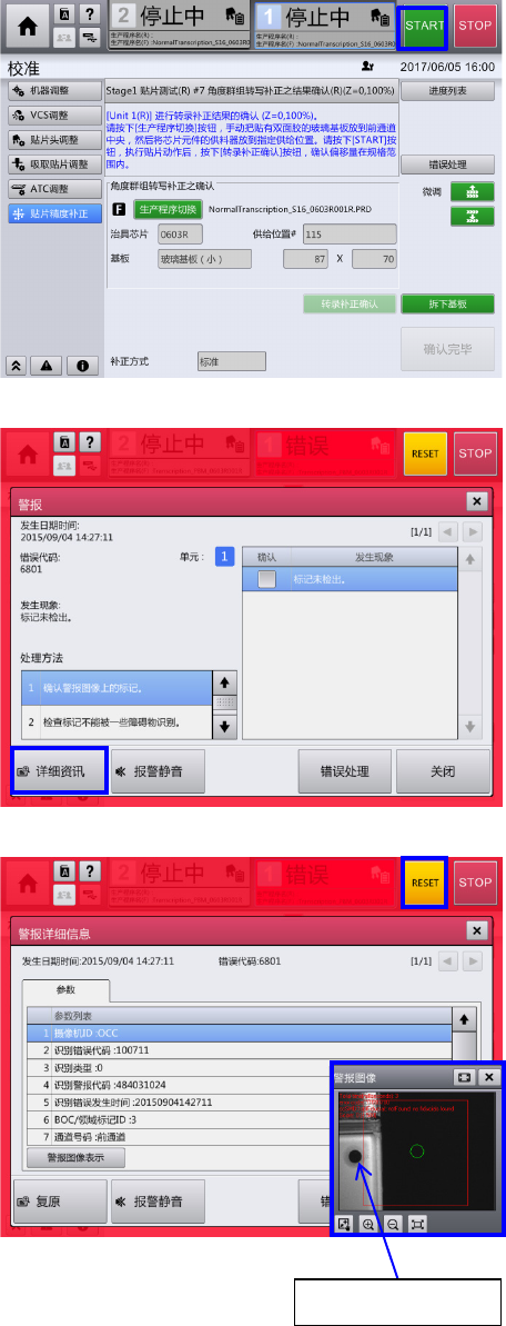 第 4 章 操作篇 4- 16. 校准 441 4 5-5. 执行贴片精度测 量 所有元件贴片完 成,选择『转录补正确 认』后,即会使 用装置内的摄像机,自 动测量贴片后的 元件位置。 5-6. 显示贴片精度测 量结果 自动测量完成后 ,即显示结果。 测量结果良好的 情况,选择『关闭』请 关闭画面。 测量结果没成为 必要精度的情况,选择 『重新执行补正 』,从现状的测量结果 用自动算出补正 价值,请进行重新补 正。 要重新补正时, 需拆…