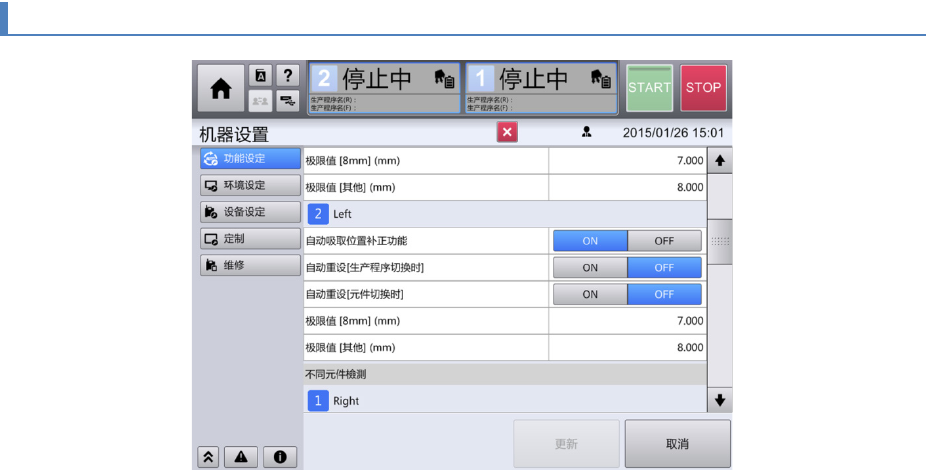 第 4 章 操作篇 4- 17. 机器设置 466 4- 17 - 13. 不同元件 检测(错误元件检测) 连续的错误计数 - 供料器 [8mm] 各供料器的「元 件识别错误」或「元件高度 异常」连续检出规定次数的 错误时,将作为具有错误元 件 (不同元件)的 可能性报警并停止。 本项目指定使用 8mm 供料器的元件的规定次数。 按各单元设定。 ( 数值范围为 1 ~ 9999) 。 ( 初始值 : 17 ) 。 极限值 [ 其…