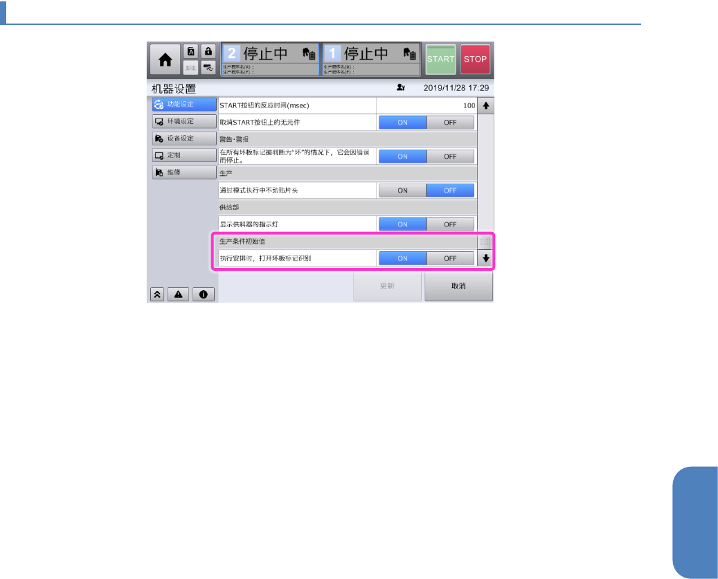 第 4 章 操作篇 4- 17. 机器设置 477 4 4- 17 - 24. 生产条件 初始值 执行安排时,打开坏板标记 识别 设置 为 ON ,则 在执 行准备 时将 [ 生产 ] - [ 生产 条件 ] – [ 坏板标记 识别 ] 初始化为 [ON ] 。( 初 始设定: ON ) 设置为 O FF ,则在执行准备时 不对 [ 生产 ] - [ 生产 条件 ] – [ 坏板标记识 别 ] 的设定进行初始化,继续 之 前的 设定…