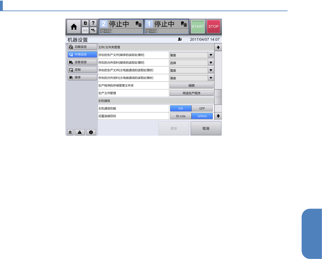 第 4 章 操作篇 4- 17. 机器设置 483 4 4- 17 - 30. 文件 / 文件夹管理 存在的生产文件 [ 媒体的读取处理时 ] 从 USB 媒 体读入生产文件后 ,若装置内已有该生产文件 时,确定是否采用。 「不覆盖」:不 覆盖生产文件,按错误处理 「覆盖」:覆盖 生产文件 覆盖时,将显示 是否确认覆盖的画面。 存在的元件资料 [ 媒体的读取处理时 ] 对于从 U SB 媒 体读入生产文件时, 生产文件中包含有相…