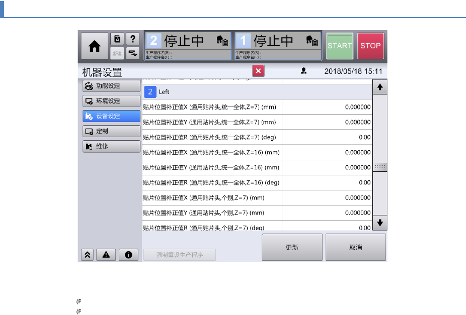 第 4 章 操作篇 4- 17. 机器设置 501 4 4- 17 - 48. 贴片位置 补正 ( 高速贴 片头 ) 贴片位置补正值 X (mm) 贴片位置补正值 Y (mm) 贴片位置补正值 R (deg) 分别为 ( 高速贴片头 ,Z=0) ( 高速贴片 头 ,Z =2) ( 高速贴片头 ,Z=4) 高速贴片头 ( P16/P16S) 的贴片 位置 X 、 Y 、 R 有整体 移动的倾向时,在补正方 向输入偏移量,提…