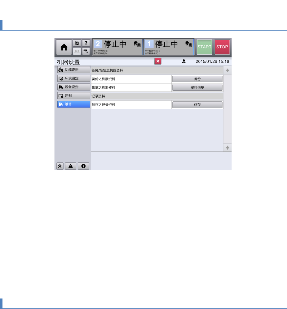 第 4 章 操作篇 4- 17. 机器设置 516 < 维修 > 4- 17 - 62. 备份 / 恢复之机器资料(备份、恢 复机器资料) 备份之机器资料 显示 [ 备份机器资料 ] 对话框, 将当前机器的机器资料备份 到 USB 存储器上 。 恢复之机器资料 显示 [ 恢复机器资料 ] 对话框, 可从 USB 存储 器上读入备份的机器资料 ,对当前装置的机器资料中 可恢 复的数据进行修 改。 校准数据也可被 恢复。…