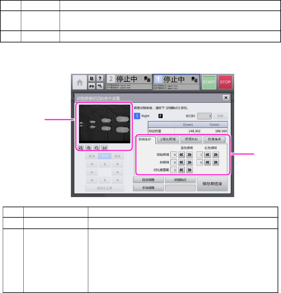 第 4 章 操作篇 4- 18. 识别镀锡印刷补偿贴片位置功 能(选购项) 541 4 4- 18 - 7. 焊锡识别的条件设置 [ 焊锡识别 的条件设置 ] 对话框,可通过轻触 操作对 [ 照明条件 ] 、 [2 值化阈 值 ] 、 [ 焊锡外形 ] 、 [ 检查 条件 ] 的 各参数 进行 设定。可使用 [ 自动 调整 ] 按钮、 [ 手动调整 ] 按钮 调出各种调整画面,以及使 用 [ 识别执行 ] 按钮 按照 指定参数 进行 识…
