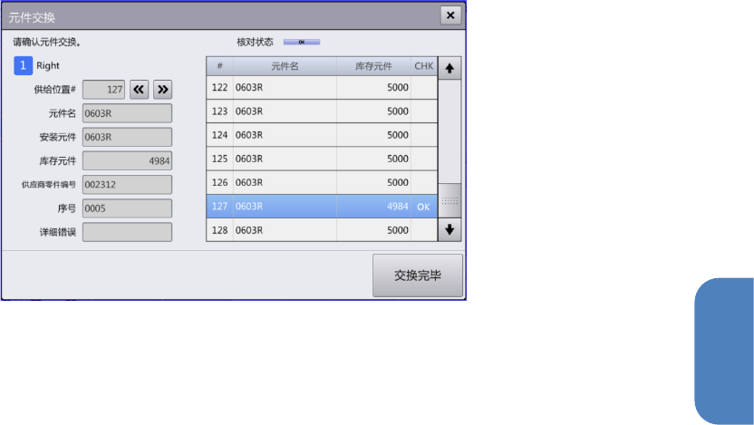(8) 触摸[交换完毕] 按钮后,发生元件用完错误的供给位置的 [CHK] 变为 OK 的供料器,在实际供给位