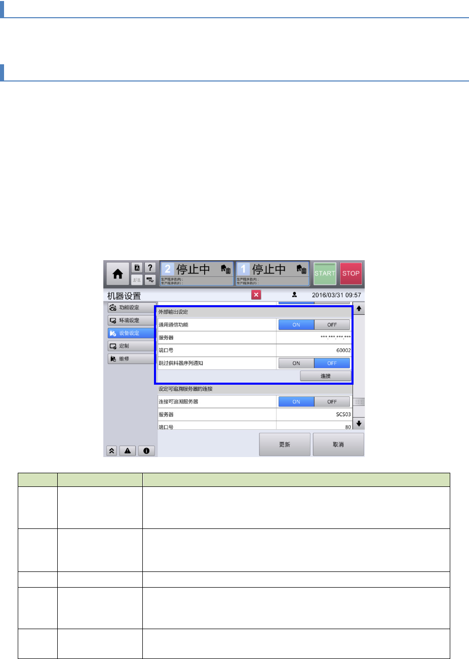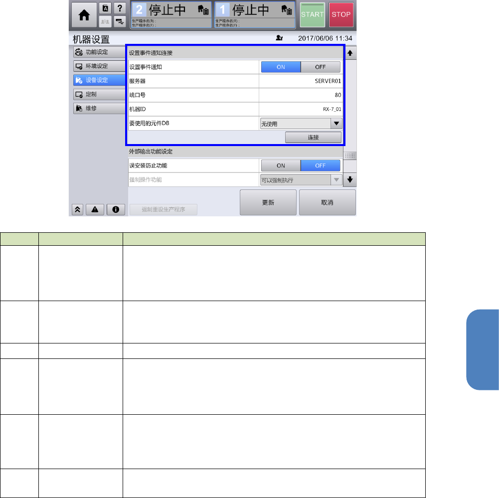 第 4 章 操作篇 4- 22. 外部输出功能的使用(选项) 599 4 设置事件通知连接 记号 名称 说明 (a) 设置事件通知 选 择是否要与事件通知处的连 接处理。 为了使用误安装 防止功能,需要连接到事件 通知处。 • ON :连接事件通知 处 • OFF :不连接事件通知 处 (b) 服务器 输 入事件通知处的 IP 地址或 服务器名(计算机名)。 设置与生产支援 系统的元件核对信息通知用 服务器相同的服务器 名。 (c)…