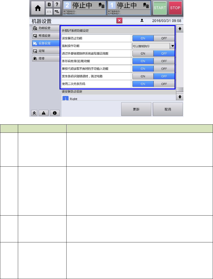 第 4 章 操作篇 4- 22. 外部输出功能的使用(选项) 601 4 记号 项目 详细情况 (e) 基板代码读取不 良 时的手动输入功 能 选择读取基板条 形码失败时,能否在用户侧 手动输入条形码信 息。 • ON :基板代码读取 失败时可以手动输入 • O FF :基板代码读取失 败时不能手动输入 (f) 发生条码识别错 误 时,跳过电路 设定 生产中发生条码识别错误 后,跳过该 电路 进行生产的功能。 • ON :基板代码读取 …