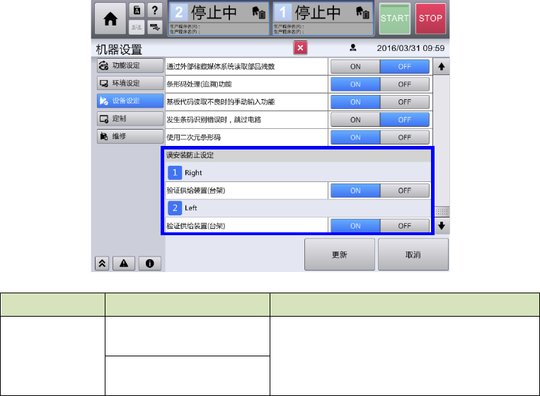 [误安装防止设定] 设定是否逐个台架实施核对确认。设定为 ON 时,生产开始前要进行元件核对。设