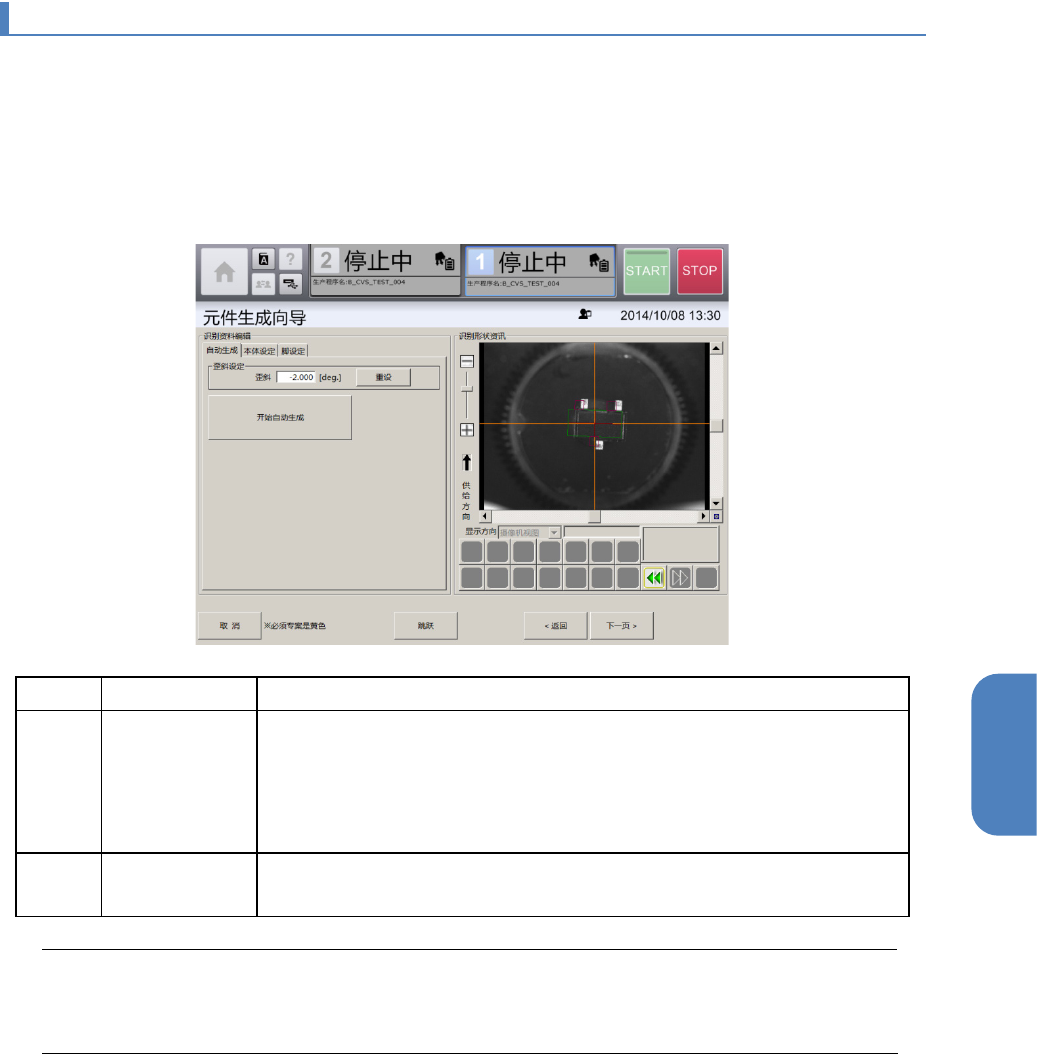 第 4 章 操作篇 4- 13. 元件生成向导 296 4- 13 - 4. 影像存取画面 切换元件识别中 使用的照明层级,将切换时 的摄像机图像显示在 [ 识别 形状 咨询 ] 区域 。 Tips 在本画面中选择 的 [ 亮灯时间 ] 、 [ 照明层级 ] ,除了在摄像机图像取 得的处理中 使用 外,也会作 为元件数据被注 册,成为自动生产中使用的 照明条件。 记号 名称 说明 (a) 摄像机 选择 使用的摄像机,进行设定 。 高…
