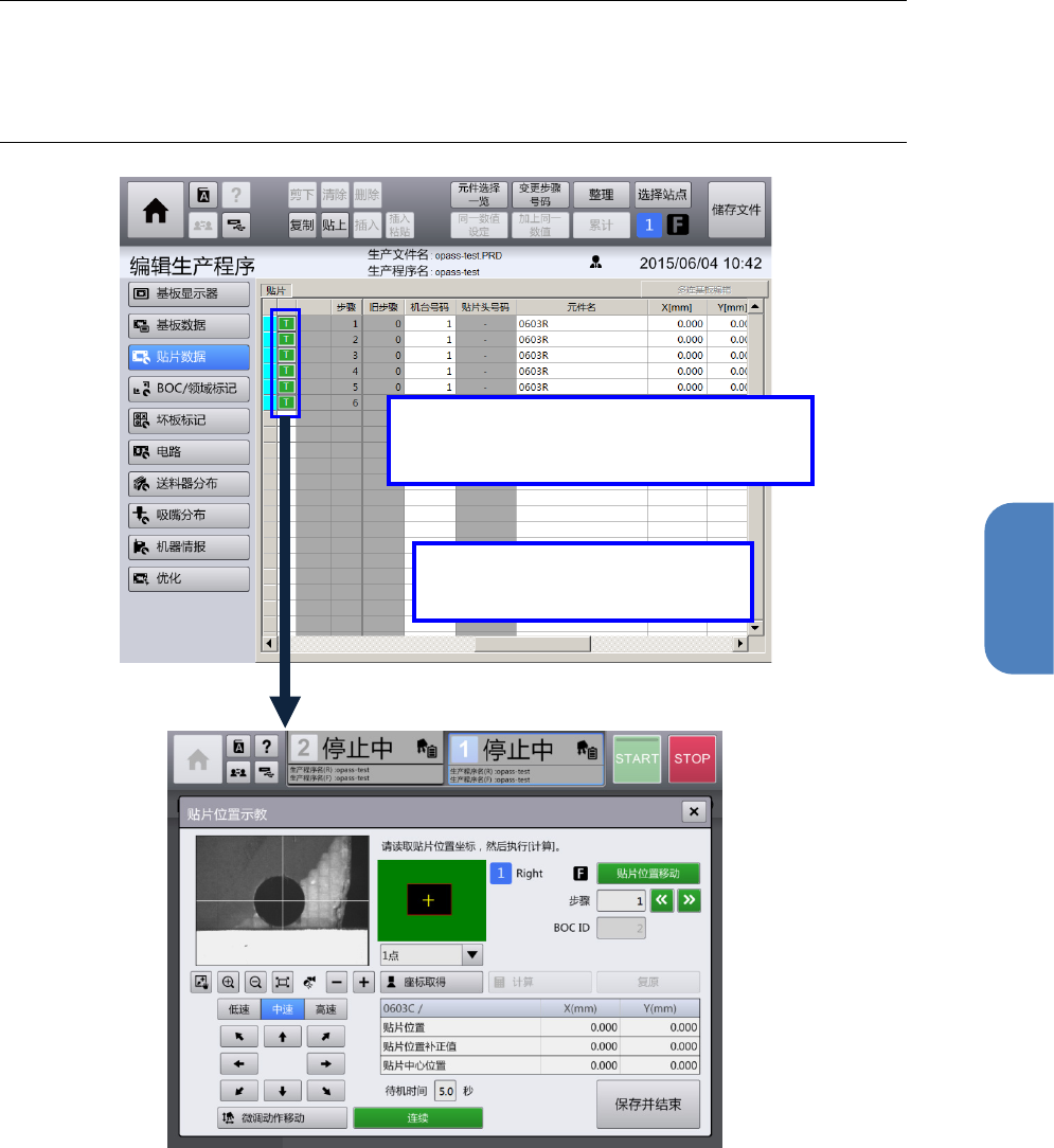 从 [编辑生产程序] – [贴片数据] 画面触摸要进行元件贴片位置示教的步骤的 [T] 按钮,即显示[贴片位