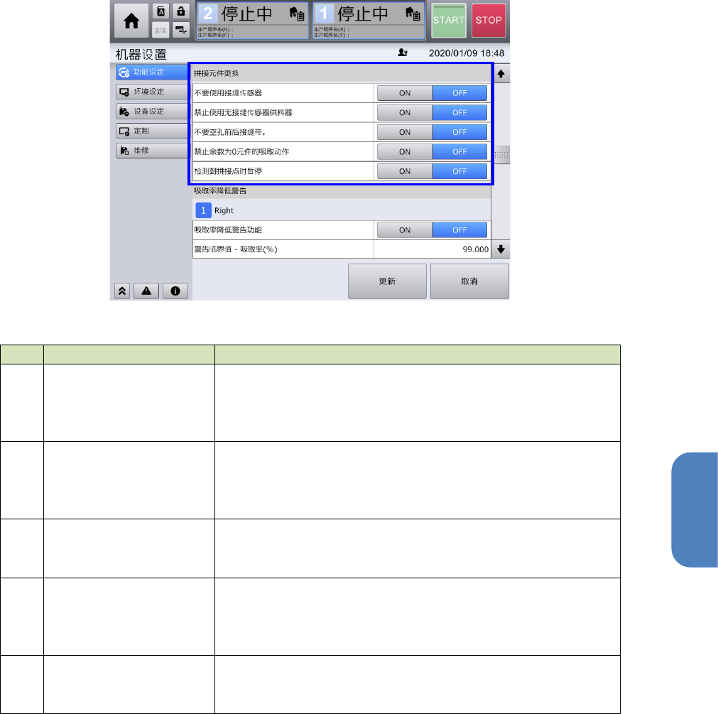 选择功能 ON/OFF,该功能为在整体装置中不使用接缝传感