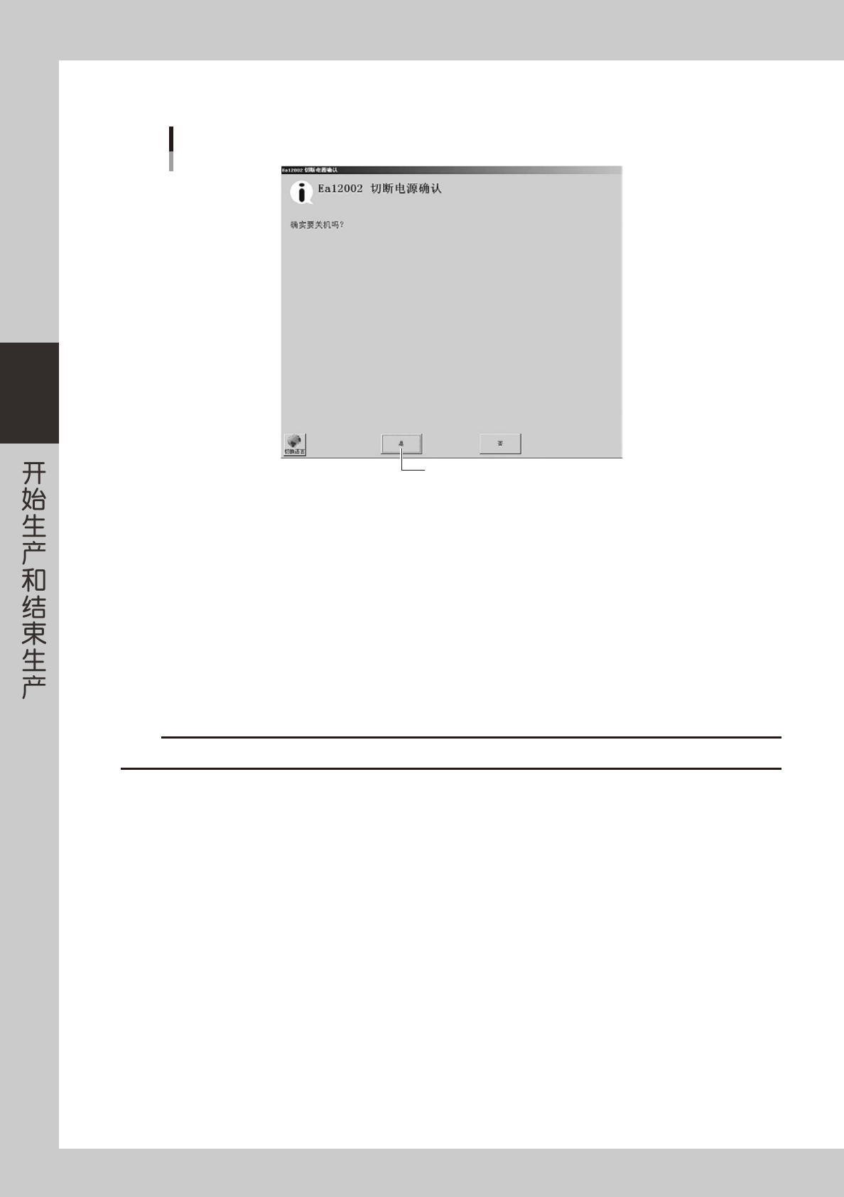 3-12 3 4 确认对话框显示后,按 [ 是 ] 按钮。 按[是]按钮 结束生产的确认对话框 26307-L6-00 5 向原点位置移动。 原点移动对话框显示后,按 [OK] 按钮。 6 切断电源的确认对话框显示后,按 [OK] 按钮。 e 7 按紧急停机按钮。 紧急停机对话框显示后,按紧急停机按钮,再按 [OK] 按钮。 8 将机器的电源开关旋至 OFF。 允许关闭电源的画面显示后,将贴片机右下方的电源开关向左旋至 OFF。 c 注…