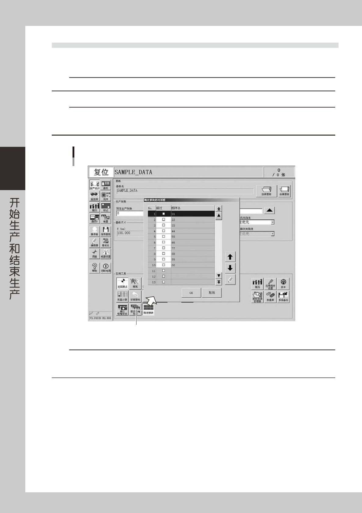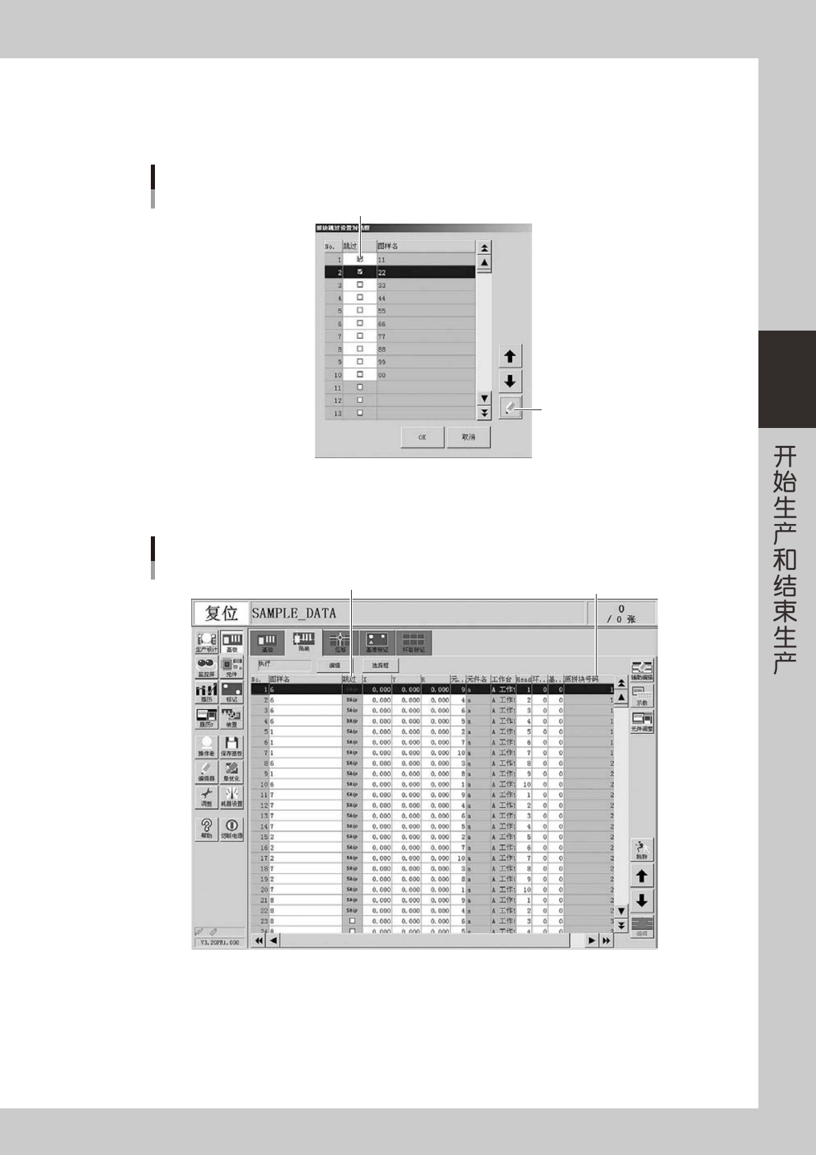 3-8 3 1.2 使用「跳过拼块」 如果读入扩展了拼块的基板程序,生产设计画面的 [ 跳过拼块 ] 按钮会被激活。按此按钮,可以打开「拼块跳过设 置对话框」画面。想以拼块为单位跳过贴装时,使用此功能。 n 要点 拼块跳过功能, 只能在执行了拼块扩展 ( 有参考数据 ) 的基板程序中使用。关于拼块扩展的详细内容, 请参阅 YS 系列程序设计手册。 c 注意 此功能,只有在版本为 VGOS V3.11STD R1.000 以后的应用程序中…