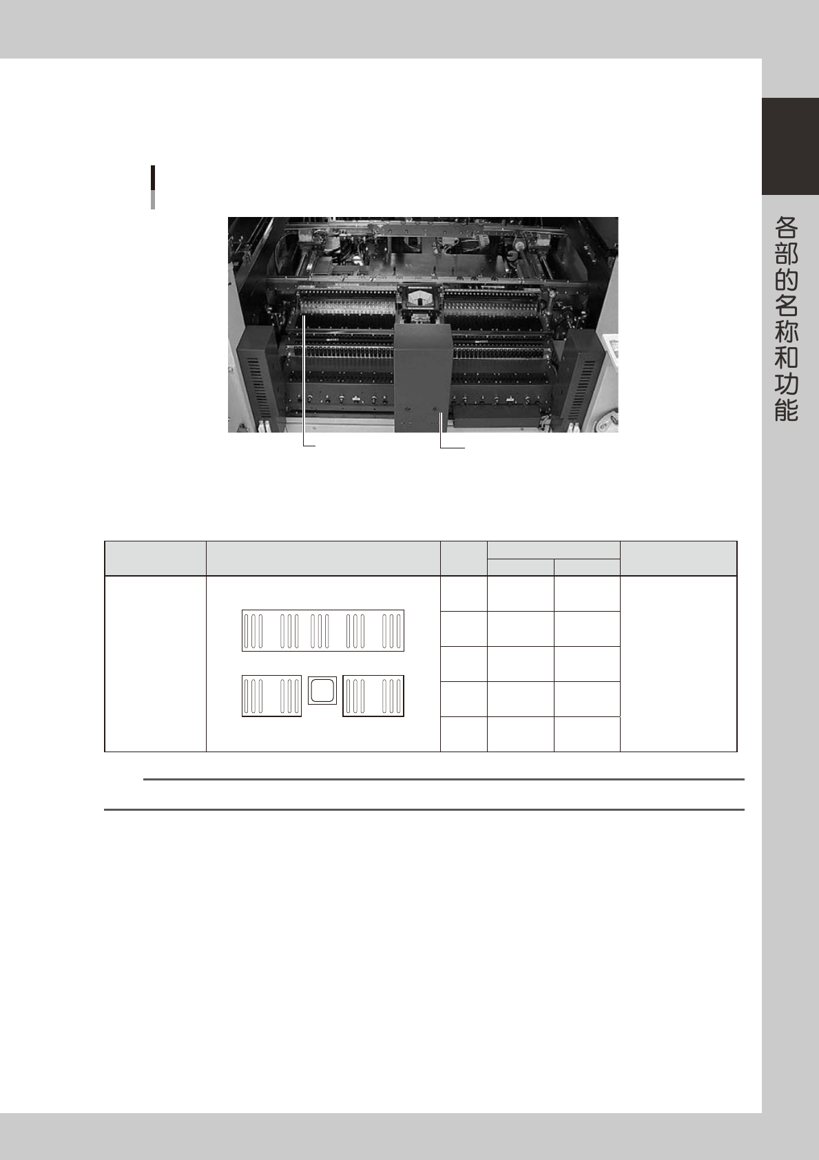1-14 1 4.1.3 一次性换料车 一次性换料车,是预先将接下来将要生产的基板所使用的送料器安装在料车上,以料车为单位更换送料器的装置。 ■ 一次性换料车侧 一次性换料车 1 2 4 6 连续排列7英寸料带盘时 大于7英寸的料带盘 5 3 25118-L7-00 1. 把手 要移动一次性换料车时使用此把手。 2. 送料器架 可以同时安装 24 个 SS 型电动送料器 (8mm)。 3. 上下移动部固定螺栓 需要调节送料器架的高度使之…