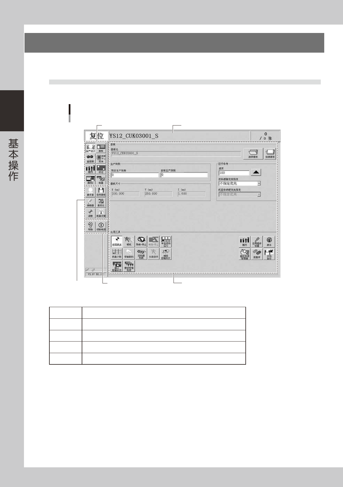 状态区域 左端显示当前的机器状态 ; 中央显示所选基板的名称 ; 右端显示基板的生产数量。