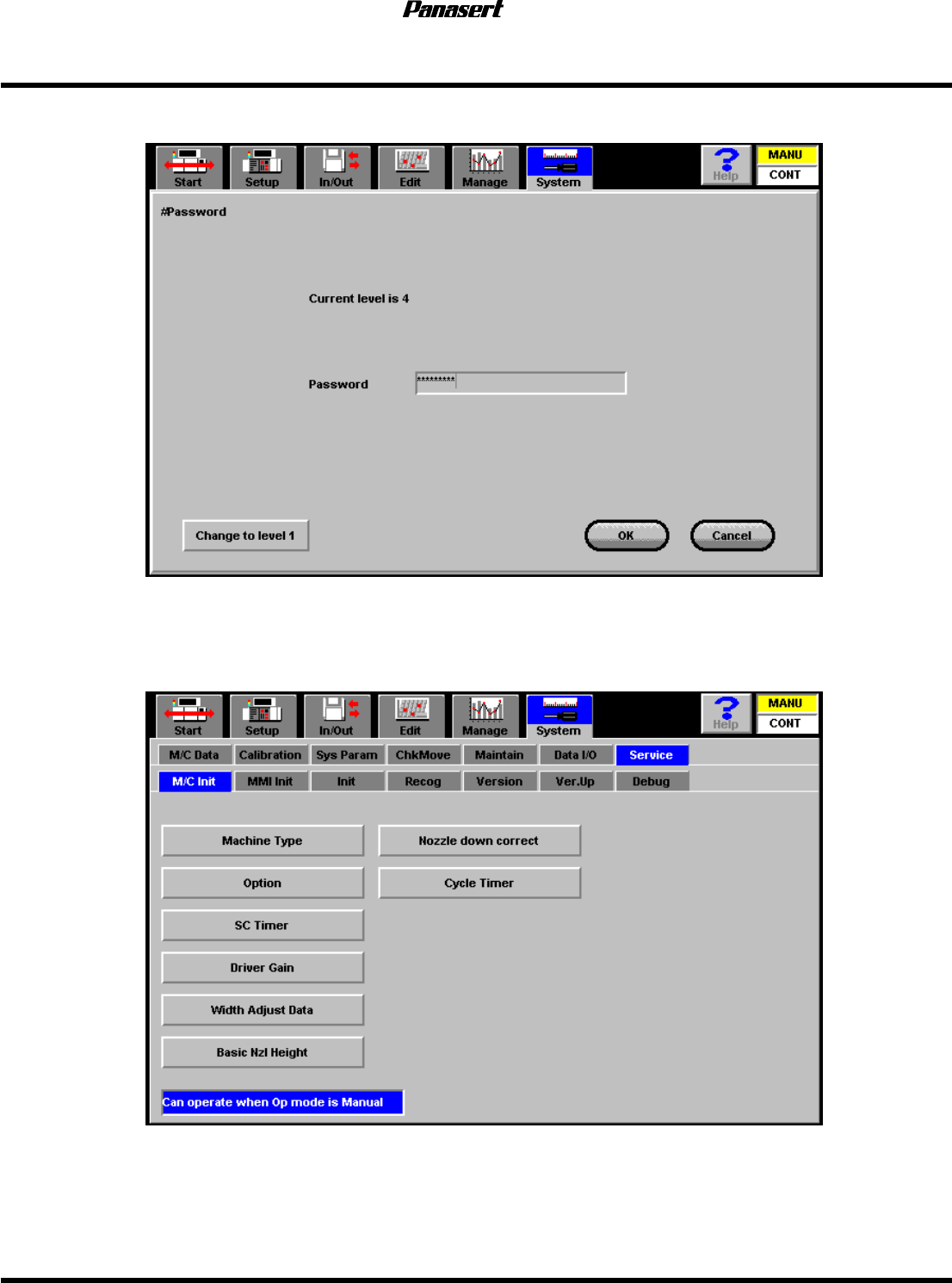 输入密码变更至操作级别 4(维修人员模式)。
