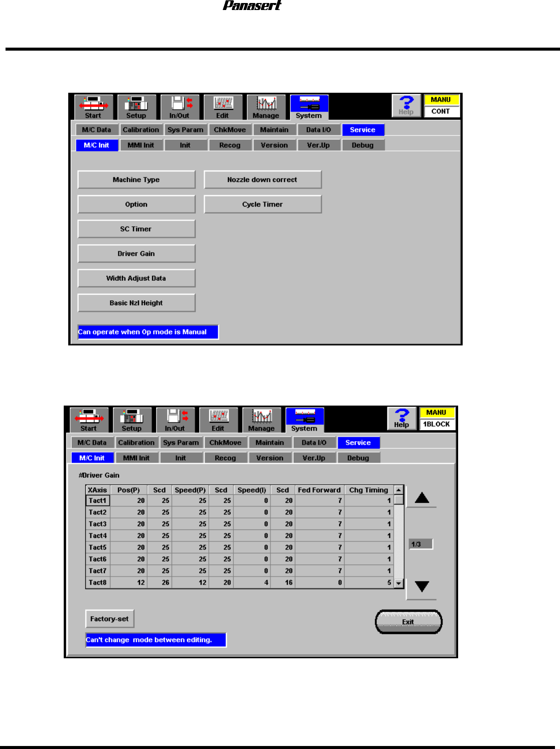 6. 选择[Service](服务)→[M/C Init](机器设定) →“驱动器增益”。