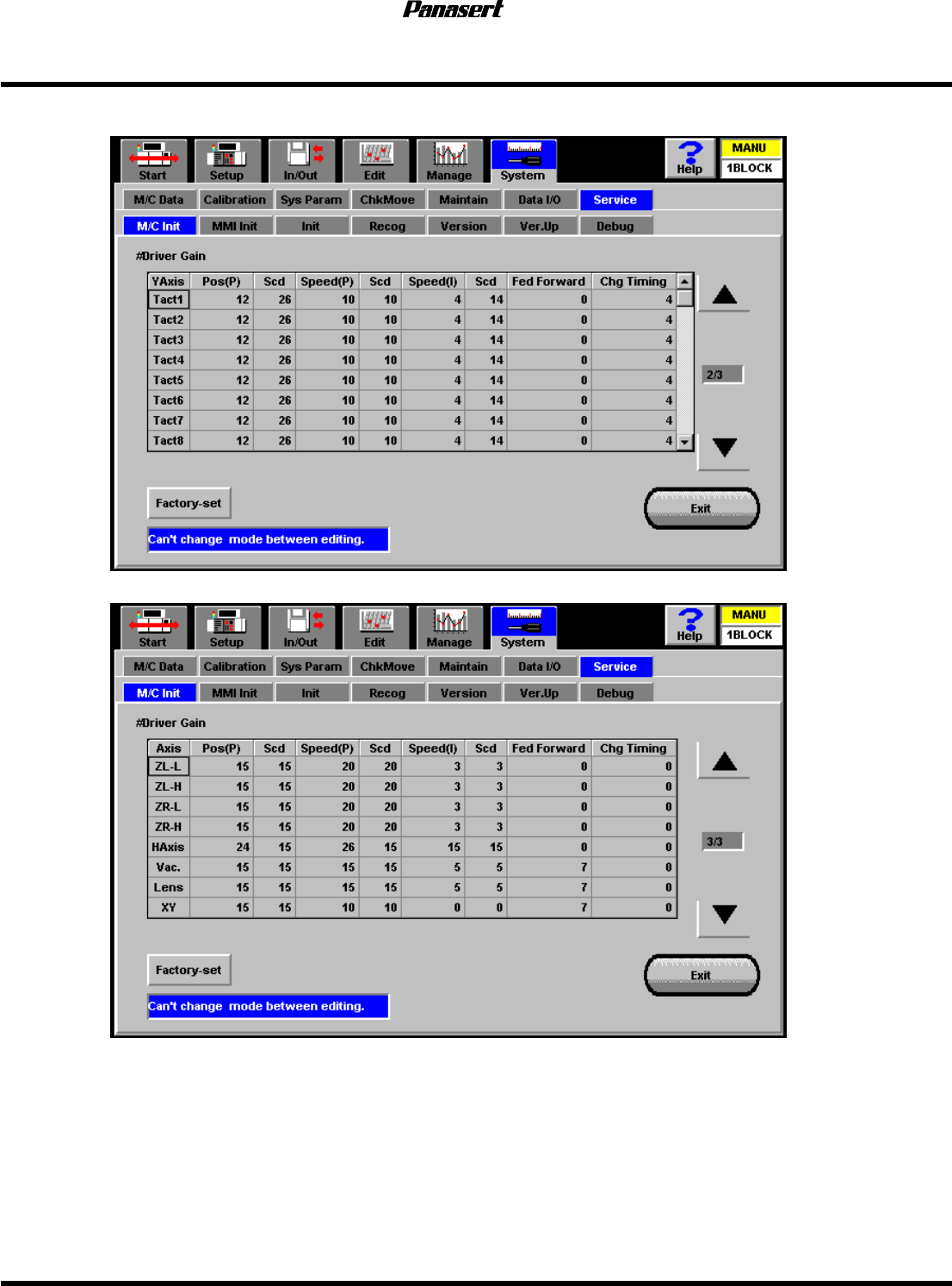 MSR 服务手册 5.1 调整 AC 伺服增益 5.1-3 D14SCC- 84-040-A 0 5. 把操作 级别转换为 4 级,并在操作 画面上选择 [System] (系统管理)。 6. 选择 [ Servi ce] (服务)→ [M/C I nit]( 机器设 定 ) →“驱 动器增益”。