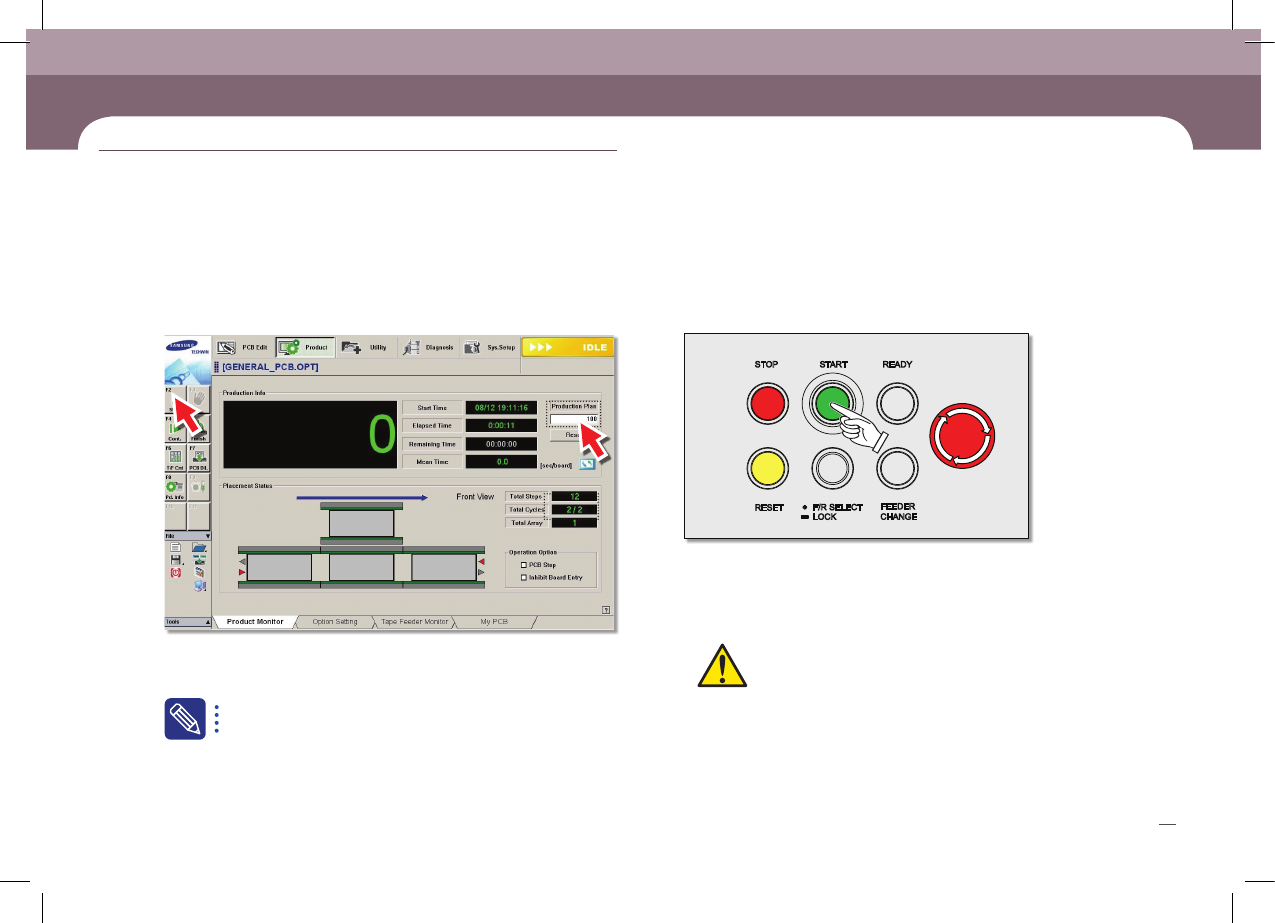 Operation Handbook 32 Cha pter 3 Fas t & Fl ex ibl e Chip Sh oot er 생산하기 본 Part에서는 생산을 수행하는 작업 절차에 대해 알아봅니다. STOP RESET F/R SELECT LOCK FEEDER CHANGE ST ART READY - <Product Plan>에 생산량을 입력한 후 'Start' …