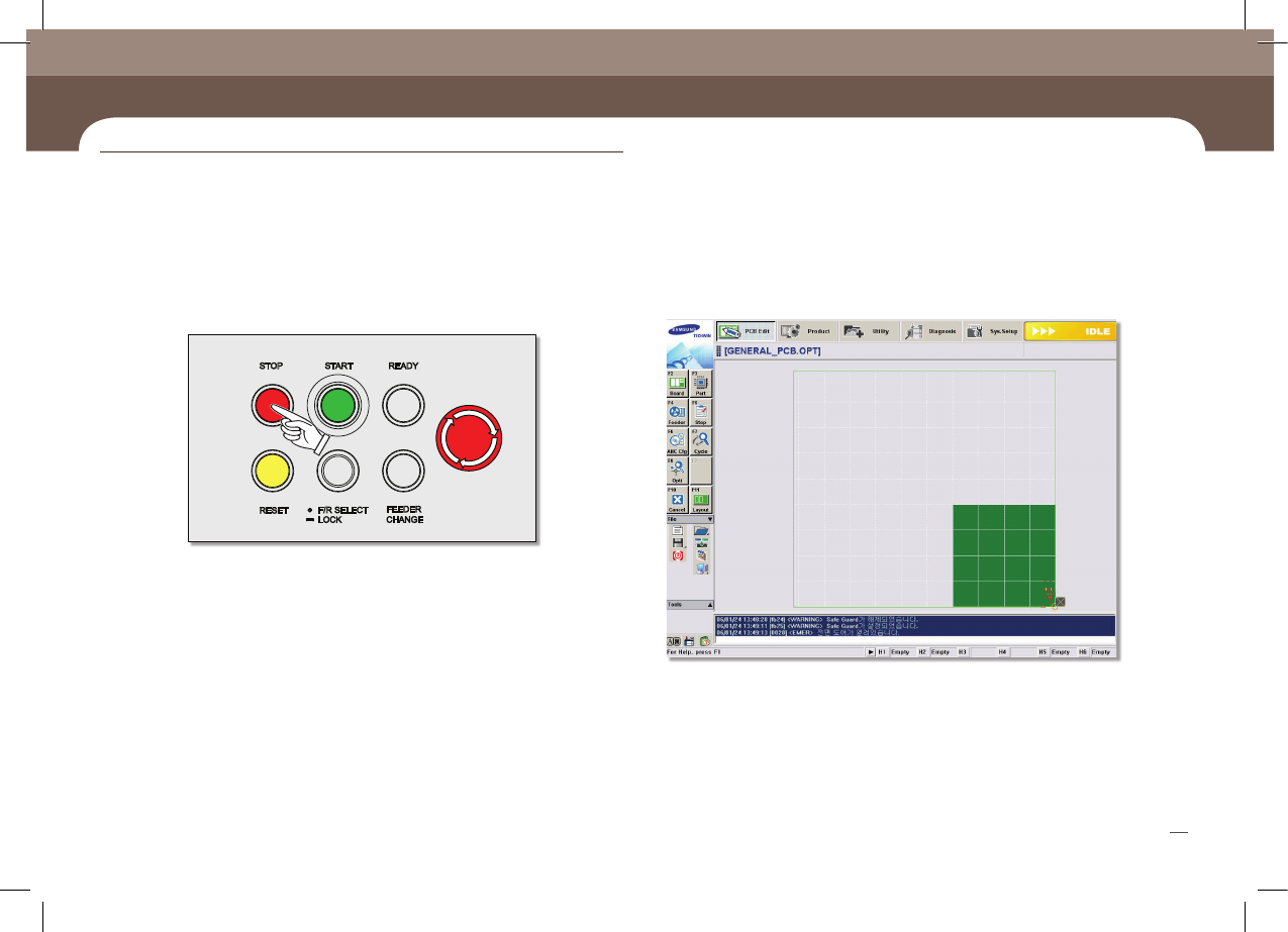 Operation Handbook 44 Cha pter 4 Fas t & Fl ex ibl e Chip Sh oot er 비상 정지 방법 본 Part 에서는 생산중 에러나 기타 사항을 점검하고 조치할 경우, 장비의 일시 중단 방법 (Continue/Start 모드), 비상 정지 방법(인위/시스템 비상 정지), 비상 정지 후 시스템을 재가동하는 방법 등을 알아봅니다. 2. 시 스 템 비…