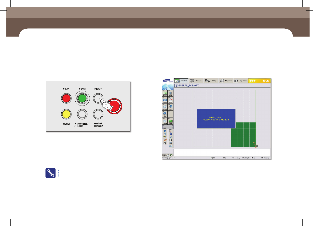 5. ‘READY’ 버튼을 눌러서 장비의 모터에 전원을 공급합니다. 6. 필요시 원점 복귀를 수행합니다.