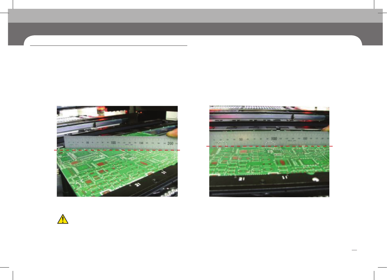 - 줄자를 이용하여 대각선 방향의 PCB의 평탄도를 확인합니다. - 줄자를 이용하여 수평방향 3지점에 대한 PCB의 평탄도를 확인합니다.