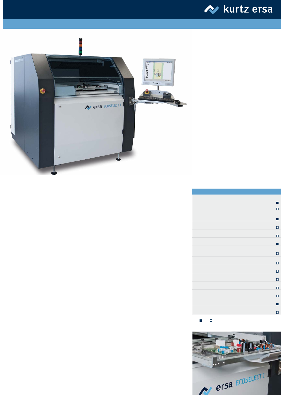 E rsa ECOS EL EC T 1 技术卓 越 的小型选 择 焊系统 ECOSELECT 1 与单元生产环境实现完 美结合 作为选择焊系统中全球技术的领先者, Ersa 在其 产品系列中又新增一款 ECOSELECT 1 :这款选择 焊机器占地面积不到 3 m² ,可与单元生产环境实 现完美结合。该半自动 ECOSELECT 1 系统与大型 Ersa VERSAFLOW 系统一样,在所有工艺流程中 均使用成熟可靠的 Ersa 选择…