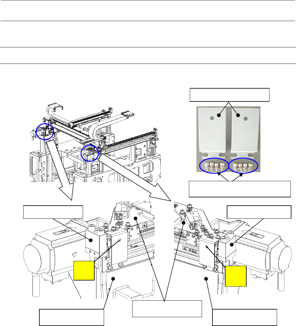 安装要领书 5-1 5. XY 装置关系 5.1 取下 X 轴框架固定部件 取下固定 X 轴框架的 Y 轴固定板和安装注 意标签。 ※ 左右的 X 框架端头均进行 调整。 请把 X 轴框 架固定到靠进机 械前侧。 最后请确认 X 轴的前后移动动 作。 X_FRAME_END 组件 注意 标签 注意 标签 BASE_FRAME 组件 BASE_FRAME 组件 固定螺丝 ( SL6061292 TN )( 8 个) Y_STOPPER 组…