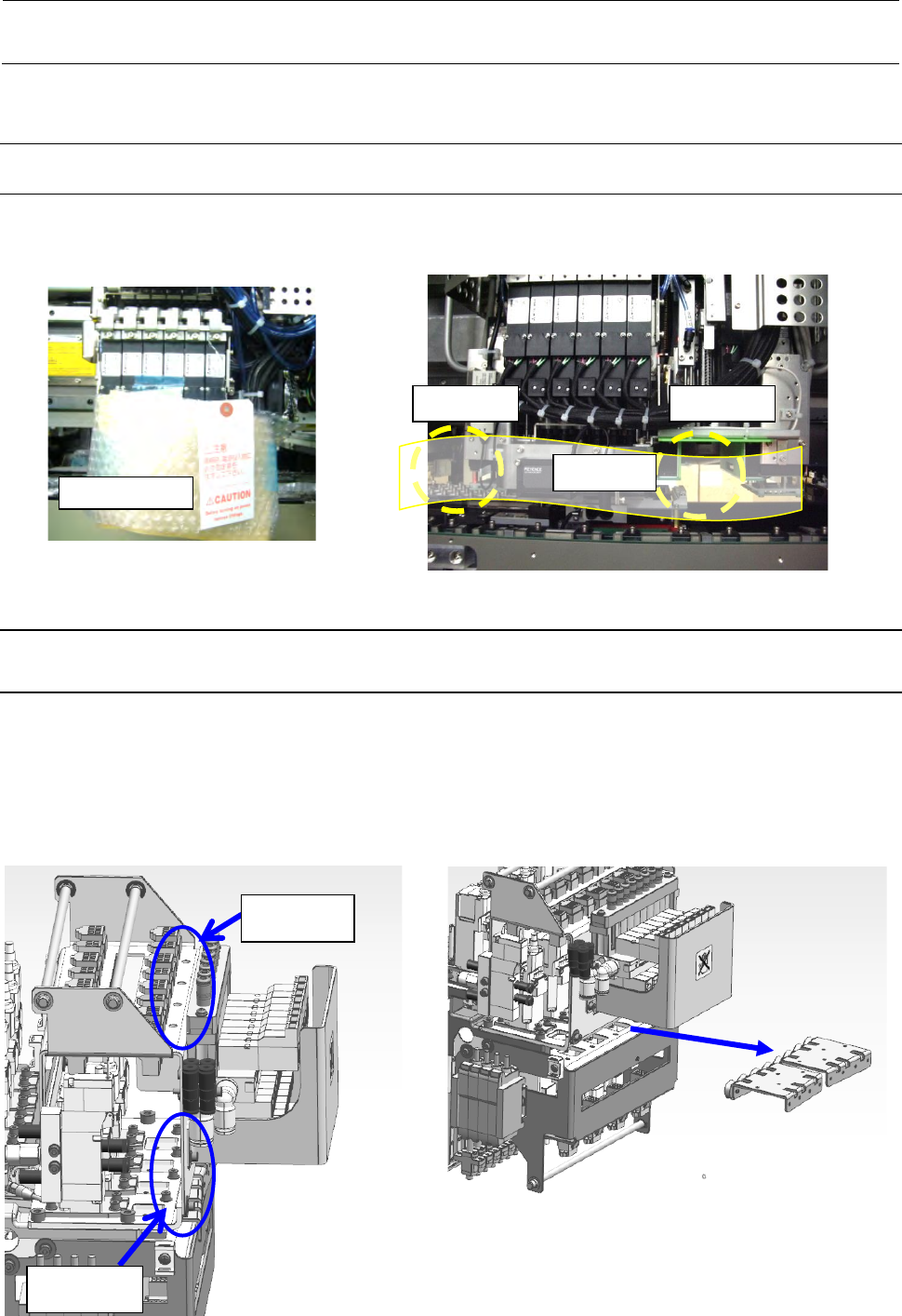 安装要领书 5-2 5.2 取下贴装头固定部件 请取下固定贴装 头的止动器和安装注 意标签。 取下后,请确认 贴片头可左右移动。 X STOPPER PLAT E (L132E821000) SCREW(SL606129 2TN) (2 个 ) X STOPPER PLATE 、 限动器橡皮的粘 贴面