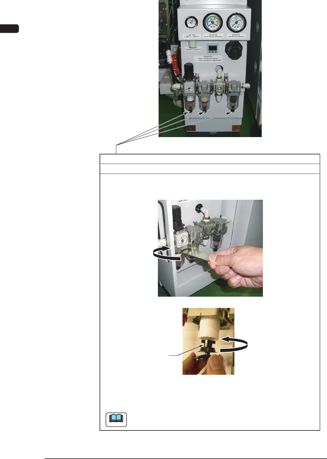 4OM-1604 1-18 第一章 3. 维护保养部位 101 1-002 过滤器 每三个月 清扫 所要时间:5分钟 (1) 卸下空气过滤器。 使用空气过滤器外壳治具,向图中箭头方向转动外盒部,拆卸外盒。 (2)向左转动过滤器架拽出。 (3)拽出过滤器,进行吹气清扫。 (4)插入过滤器,向右转动过滤器架装上。 (5)安装过滤器外盒。 过滤器损坏时,请更换新的过滤器。 过滤器架 F4A9 Note