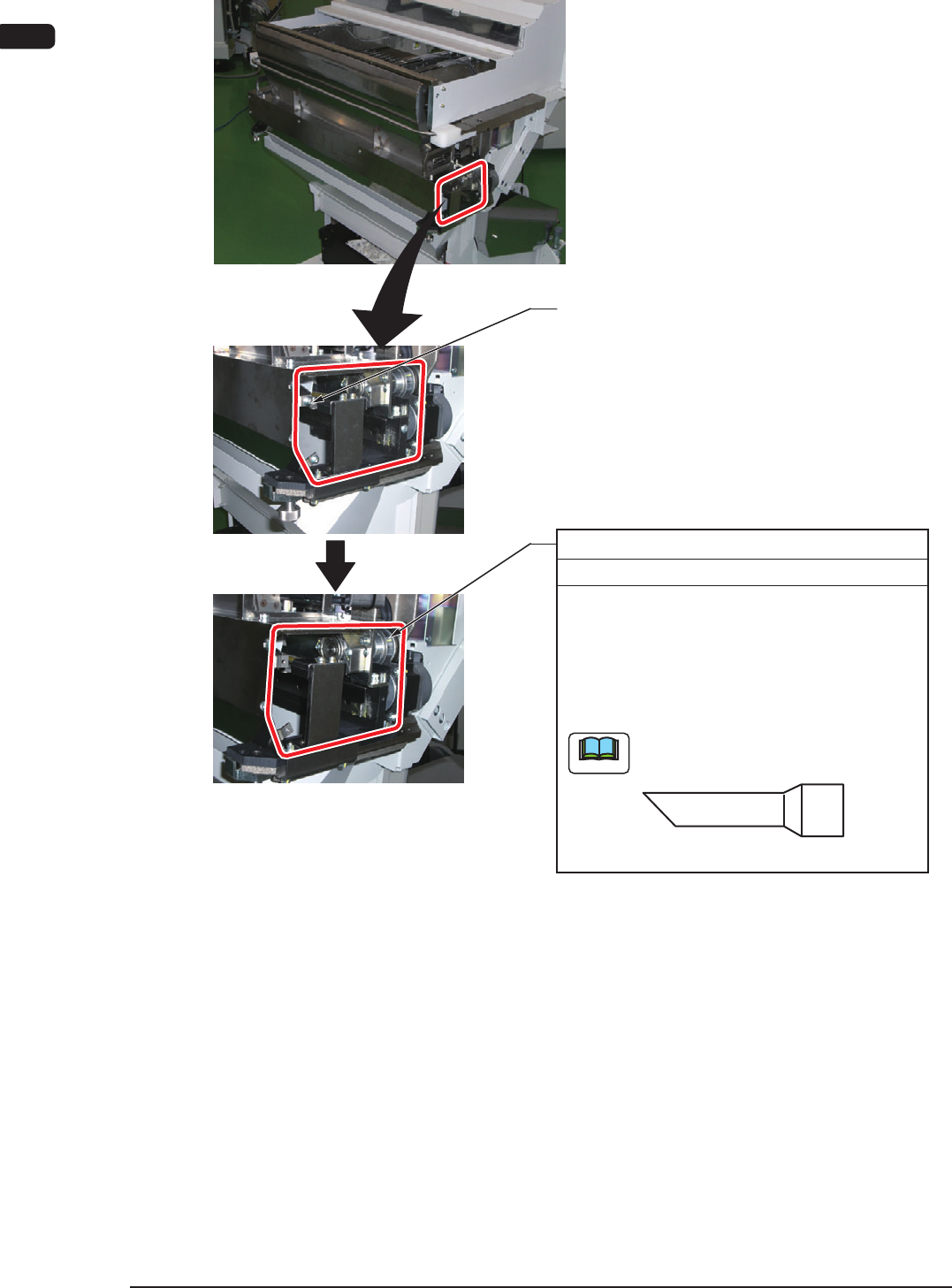 4OM-1604 1-26 第一章 3. 维护保养部位 1002-001 3.2.6 送料器推车部 ( 切割器 ) 切割器箱内 每周 清扫 所要时间:10分钟 (1) (2) (3) 拆卸送料器批量更换推车。 拧下送料器批量更换推车切割器部分的螺 丝钉(12处),拆卸机盖。 请用吸尘器清扫切割器部内部的垃圾、灰 尘。 请使用狭细的吸尘口。 吸尘口(推荐) 也拧下相反侧螺丝钉。(共12处) F4A20 Note