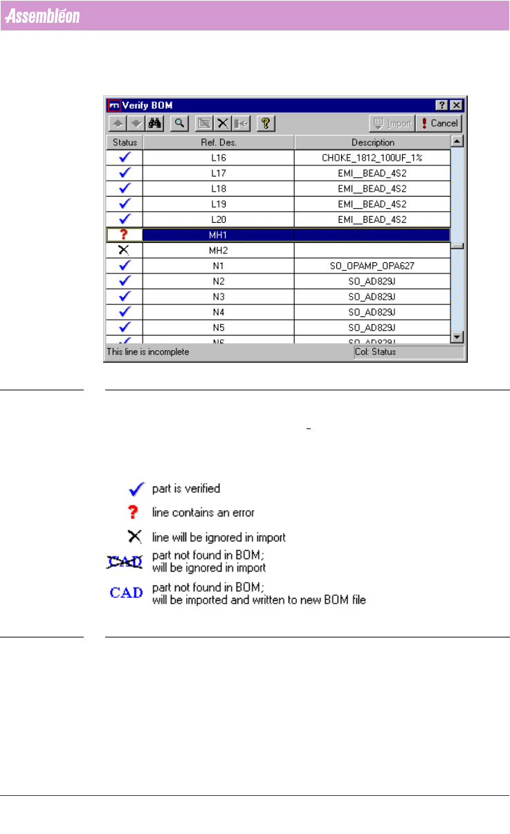 The Verify BOM dialog (see SCREEN 20 on page 28) box checks to see if each