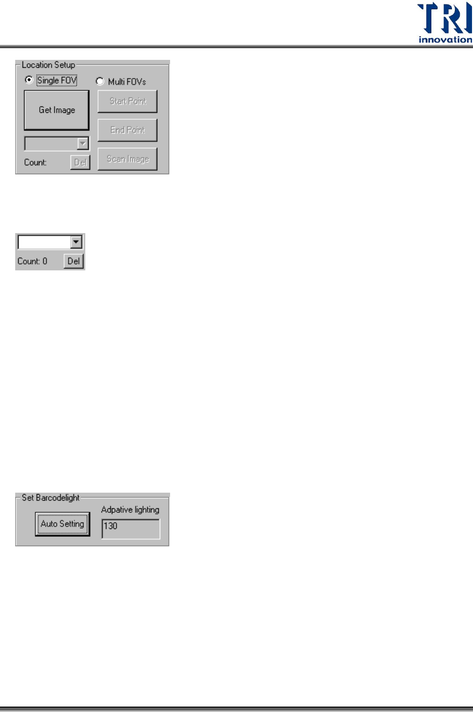 Test Resear ch Inc. 122 TR 7700 S II User Guid e – Softwar e 下拉選取方塊、 [Count] 欄位以及 [Del] 按鈕為特殊功能,一般情況下無作用。 Multi FOV – 當條碼的大小超出一個 FOV 範圍的話,點選 [Multi FOVs] ,先按下 [Start Point] 指定條碼開始位置,以及按下 [End Point] 指定條碼結束位置,接著按下 [Sc…