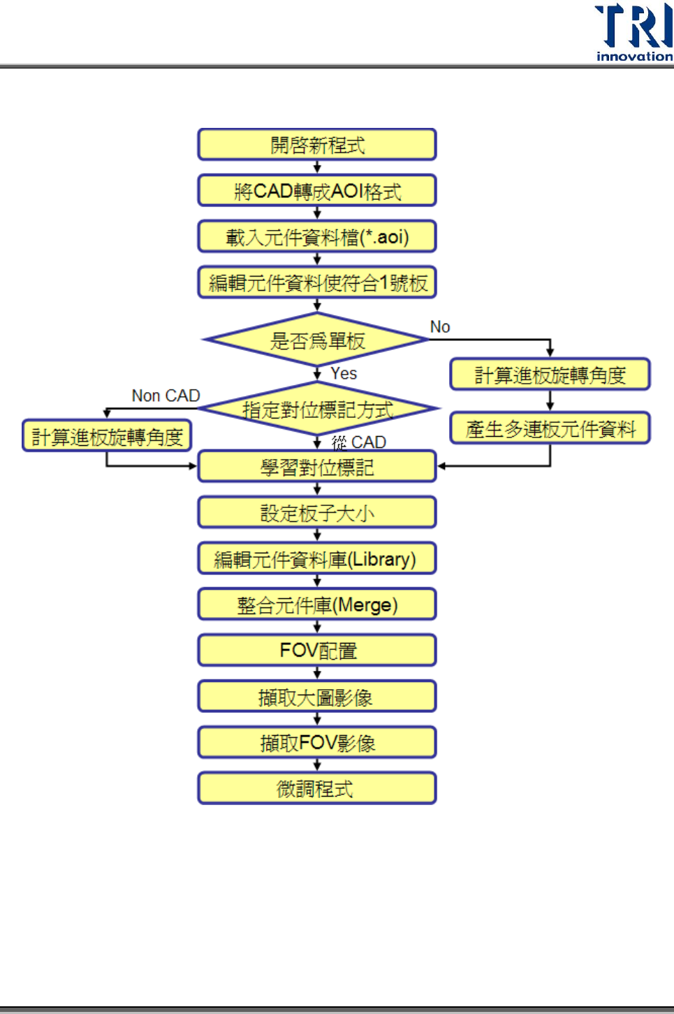 Test Resear ch Inc. 2 TR 7700 S II User Guid e – Softwar e 1.3 程式製作流程圖 1.4 相關檔案 ModelName*pre :程式檔案。 ModelName*aoi : AOI 可直接讀取的 CAD 檔 案。 ModelName.bmp :大圖影像。