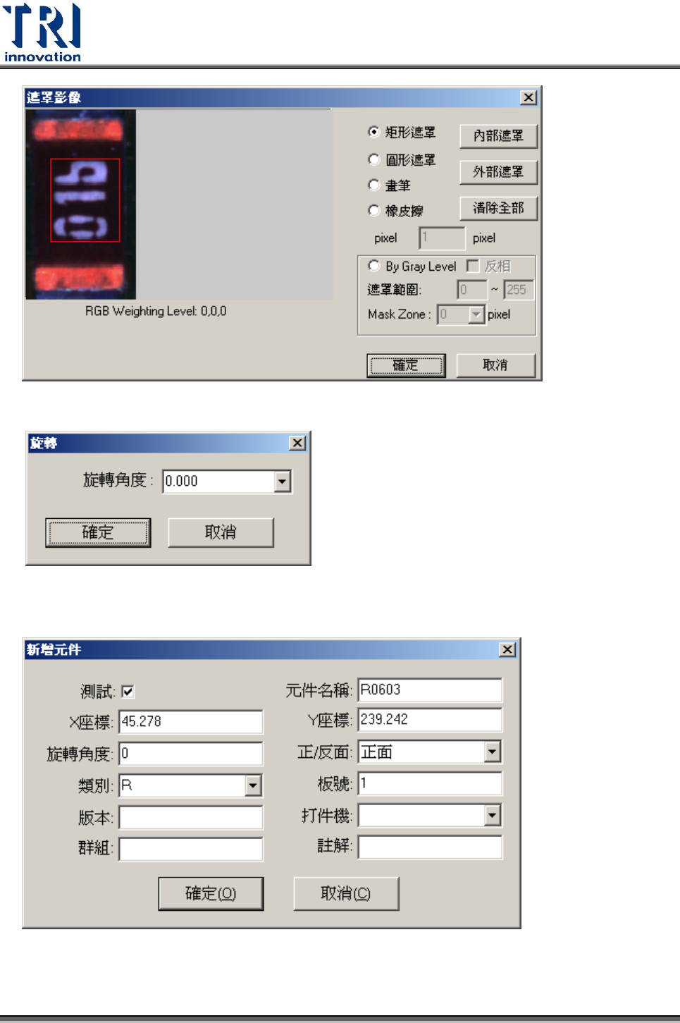 Test Resear ch Inc. TR 7500 Series User Guide – Soft ware 167 Step11. 如果有需要可以按右鍵,選擇 [Set Angle] 去設定元件角度。 Step12. 完成後關掉 [FOV Image Dialog] ,會出現對話框,使用者需要 輸入元件名稱及類別。 Step13. 若要繼續在為相同類型的元件增加座標,先點選之前新增元
