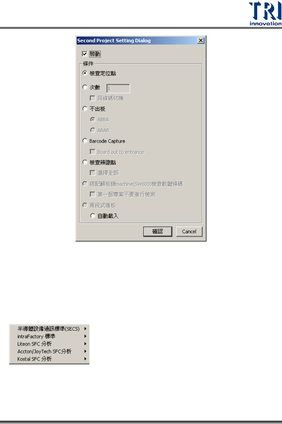Test Resear ch Inc. 178 TR 7700 S II User Guid e – Softwar e 4) 開啟第一段的程式檔 5) TRAOI 會詢問是否要開啟第二個專案檔 , 選擇 [Yes], 選擇第二段的程式檔 6) 將第一段的程式存檔 當設定完成後就可以開始檢測。 3.5.8 製程管制系統 (SFC) 1. 半導體設備通訊標準 (SECS) Step1. 建立文字檔名為 [DefectCode.txt] 位…