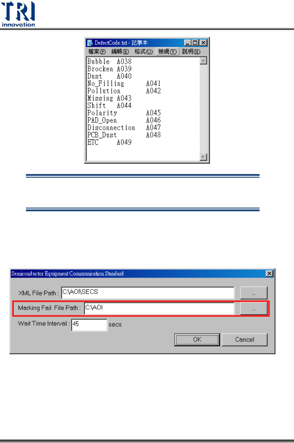 Step1. 建立文字檔名為[DefectCode.txt]位於路徑[C:\AOI\]中。文字