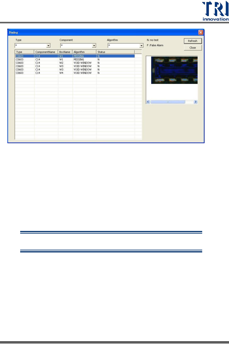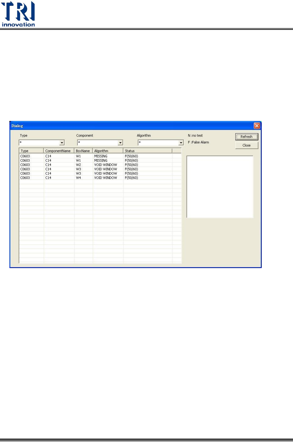 Test Resear ch Inc. TR 7500 Series User Guide – Soft ware 235 Step5. 測試完成後,系統及輸出以下報表。 當待測板已在維修站經人員確認後,發現該元件為 [PASS] ,則使用者需調整程式, 再重新檢測該元件。若結果檢測完後該元件仍為 [FAIL] ,表示對於調整完後的參 數,仍會造成機台對於該元件的誤判,此時使用者可以再進行參數的調整,結果如 下圖,點選有問題的元件後…