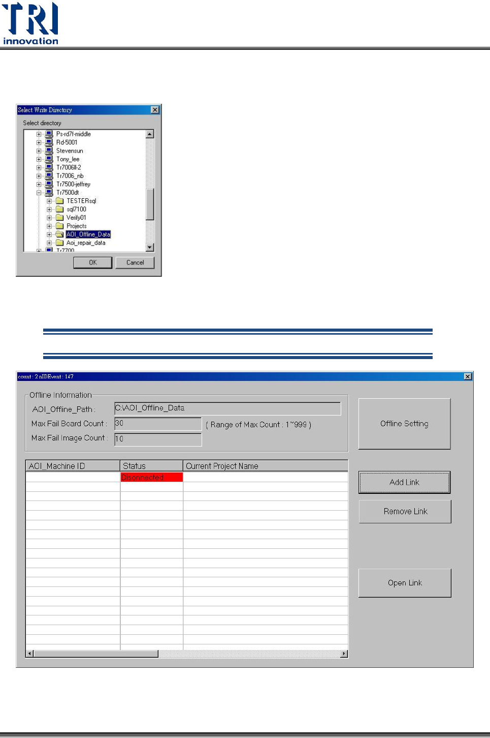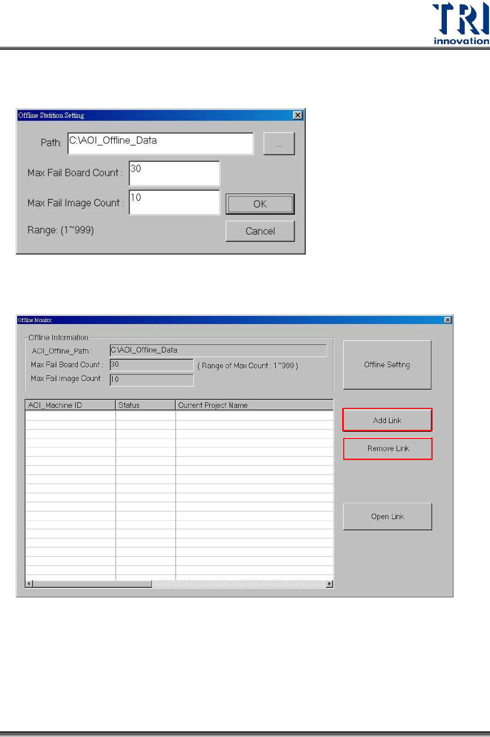 Test Resear ch Inc. 244 TR 7700 S II User Guid e – Softwar e 更改 [Offline Path] 相關資訊 3. 使用者可以選擇加入一個 Inline 機台進行監控,或是刪除一個 Inline 機台。