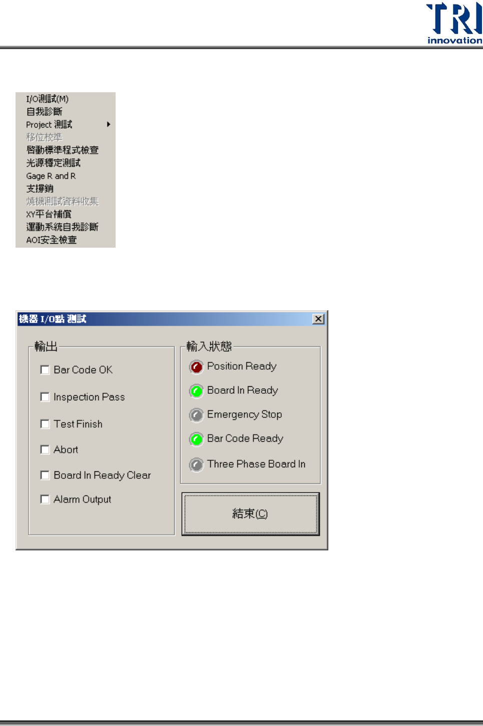 Test Resear ch Inc. TR 7500 Series User Guide – Soft ware 255 1. 主操作區 :暫時啟動或關閉指定的自我檢驗功能。自我檢驗的執行與否預設是跟 據設定對話盒中的設定,若必需執行該項檢測時按鈕會程淡灰色有勾選的狀態, 可手動將其關閉,同理若該項檢測不需執行時,可手動勾選該項檢測,這時的操 作只適用於這次的檢驗並不會儲存,若要儲存執行自我檢驗的頻率必需進入設定 對話盒方可儲存。執行…