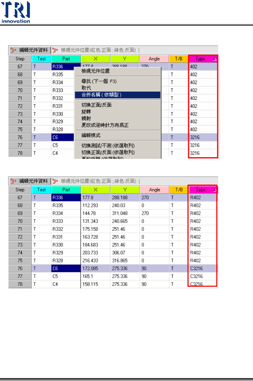 Test Resear ch Inc. 276 TR 7700 S II User Guid e – Softwar e 4.2.4 合併名稱 ( 依類型 ) 此功能是將元件的類型名稱以 “ 元件名字開頭的英文字母 + 原有名稱 ” 取代成為新元件類 型名稱,當選取某一元件進行合併時,其相同類型的元件也會同時進行合併的動作。