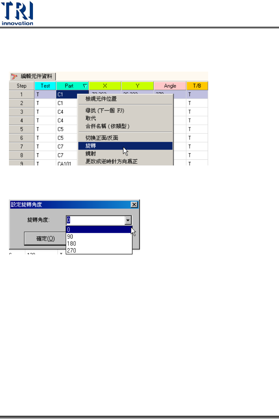 Test Resear ch Inc. 280 TR 7700 S II User Guid e – Softwar e 選擇鏡射方向視窗,可選擇 [ 左右鏡射 ] 或 [ 上下鏡射 ] ,同時需選擇欲進行鏡射的板號, 選擇後按下 [ 確定 ] 系統即開始進行鏡射動作。 鏡射後原先位於正面的元件會被設定至被面,而反面會移至正面,所以鏡射後須注意 正反面是否設定正確。 4.2.8 更改成逆時針方向為正 系統中認定元件角度的設定是以逆時針方…