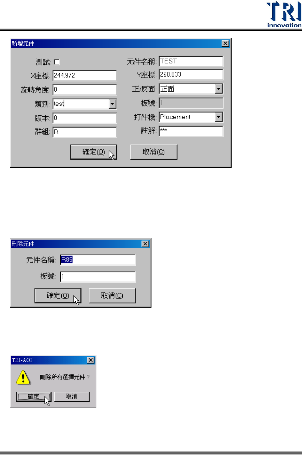 Test Resear ch Inc. 288 TR 7700 S II User Guid e – Softwar e 4.2.16 刪除元件 此功能可刪除元件資料表上的元件,可選取一個或一次選取多個刪除。 若選取刪除單個元件,則系統出現以下視窗,確認無誤後請按下 [ 確定 ] 刪除此元件。 若一次選取多個元件進行刪除動作,則系統出現以下視窗,確認無誤後請按下 [ 確定 ] 來刪除所有選取的元件。