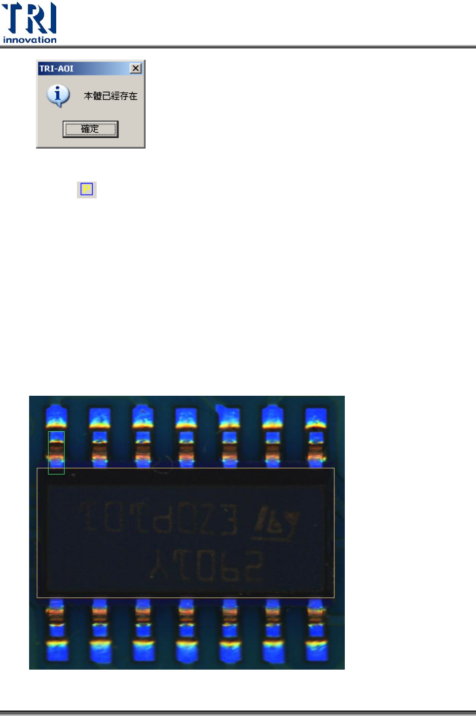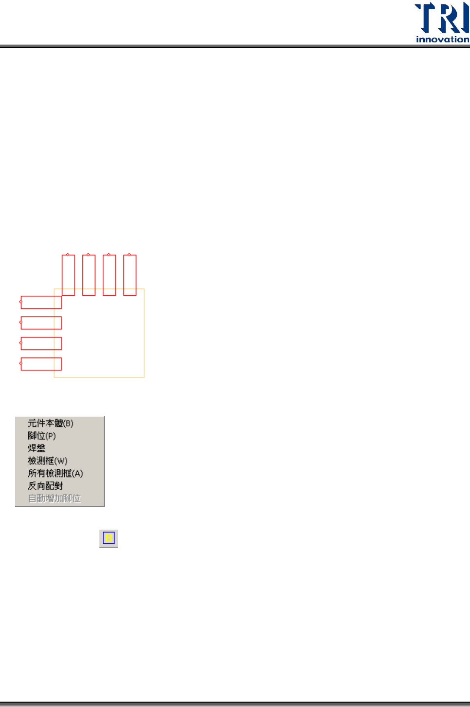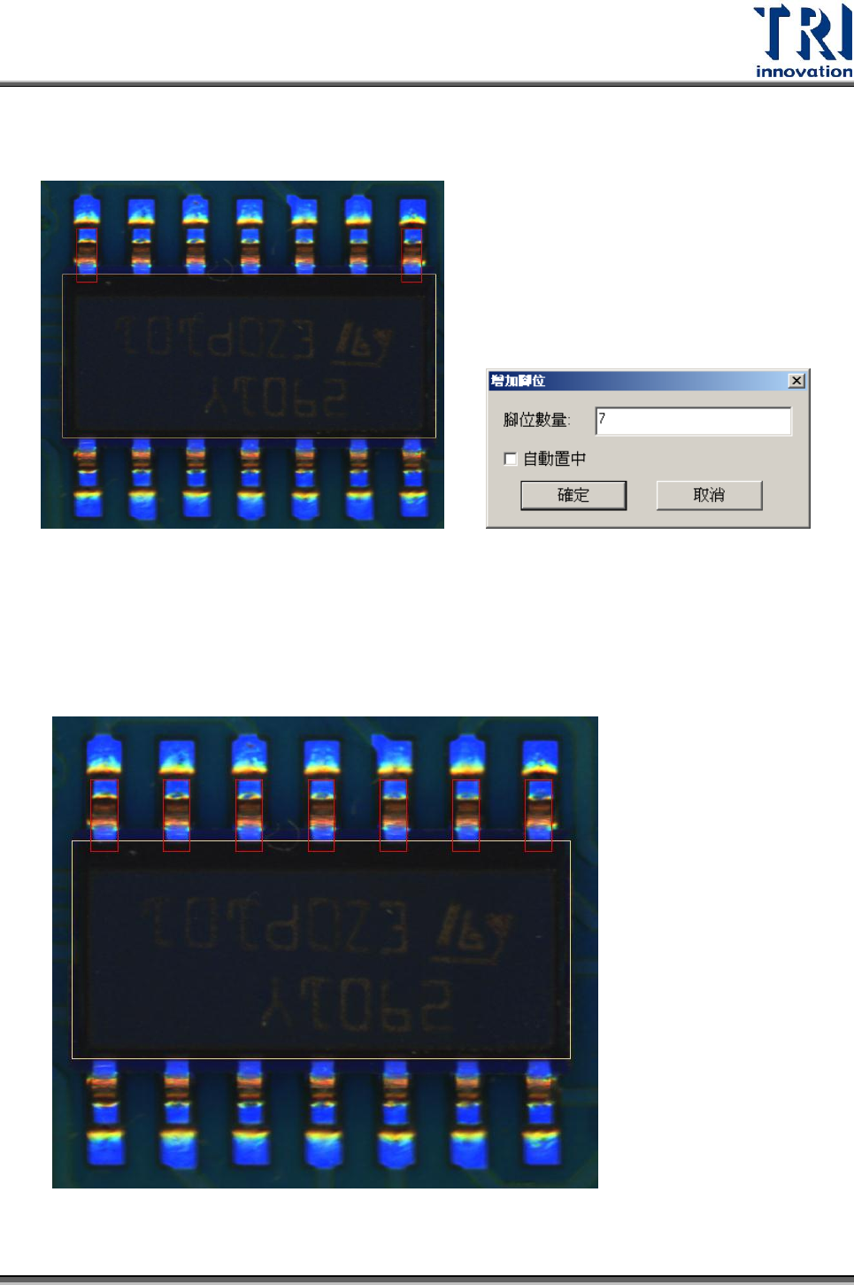 Test Resear ch Inc. TR 7500 Series User Guide – Soft ware 323 4.9.5.2 腳位 腳位框的功能是為了告知系統元件擁有 IC 腳的大小、位置及數量,以輔助完成資 料庫的建立。 使用此功能後,使用者需在影像區按下滑鼠左鍵並拖曳出一個腳位框。腳位框產生 的位置需與 IC 腳的位置相一致,因為系統是以腳位框一 開始產生的位置來判斷它 位於本體框的哪一邊。意即若 IC 腳位於…