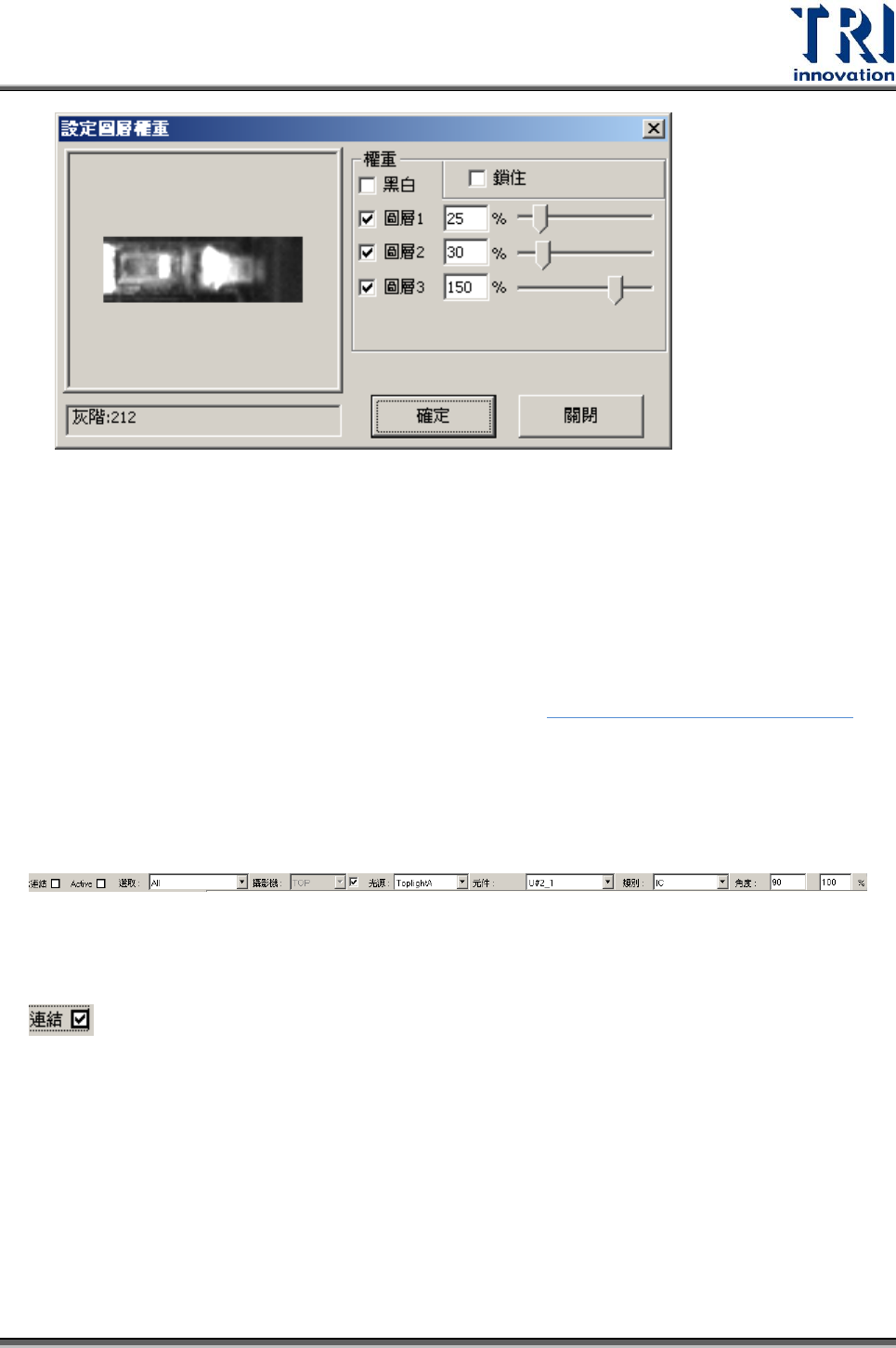 Test Resear ch Inc. 3 64 TR 7700 S II User Guid e – Softwar e 4.9.8.9 設定遮罩 設定影像的遮罩。此功能已經修改至在屬性設定欄內使用。 4.9.8.10 設定距離 檢測元件上兩個檢測框的距離,詳細使用方法請參閱 5.4.1 已儲存的 FOV 影像功能表 內的設定距離。 4.9.9 工具列 4.9.9.1 連結 顯示出目前所選取的檢測框與其他檢測框的連結關係,以亮藍色線條…