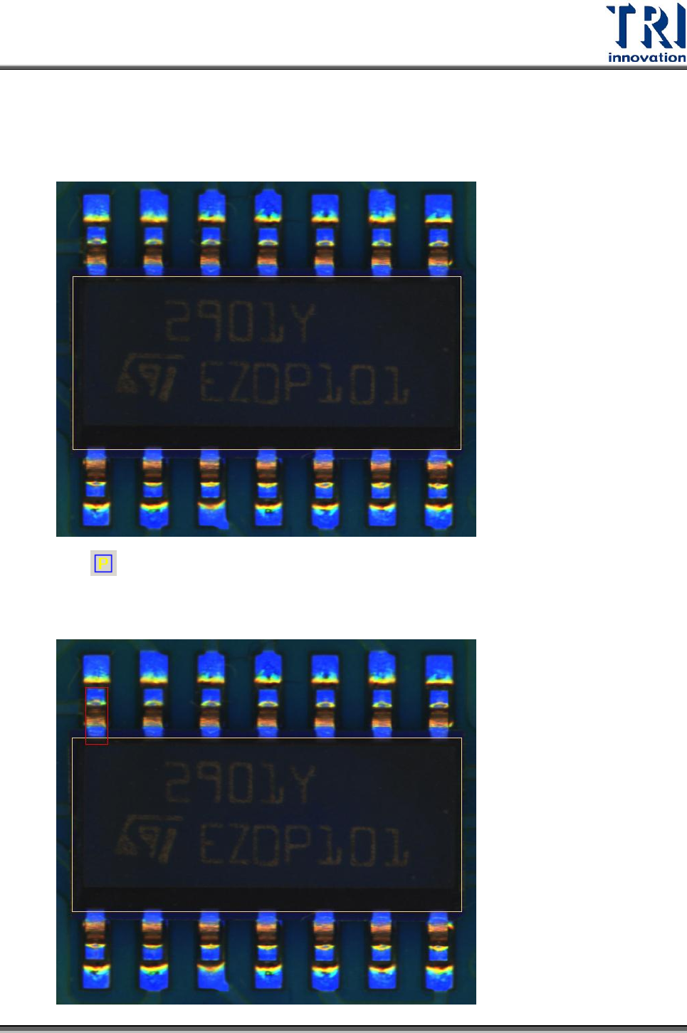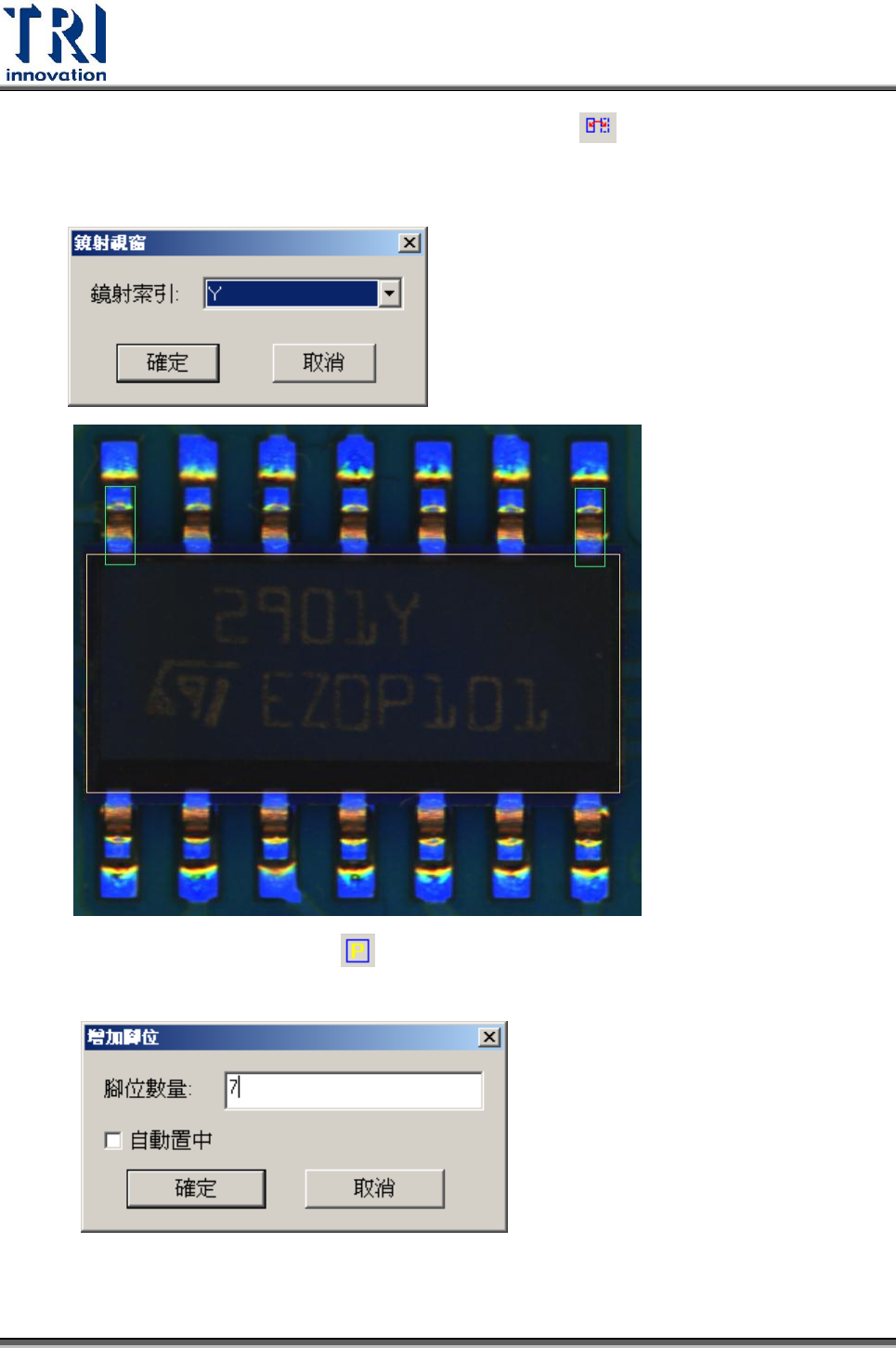 Test Resear ch Inc. 376 TR 7700 S II User Guid e – Softwar e 4.9.10.2 例 2 : IC 類 1) 選擇標準元件:在 [ 元件 ] 下拉式選單中選擇一顆沒有偏移、旋轉或損傷的元件, 接著,調整本體框的大小及位置使其與元件本體的大小一致。 2) 按下 來增加一個腳位 (PIN) 框,並將滑鼠移動到位於一端一排 IC 腳中 最邊緣的 一支 IC 腳上,拖曳出腳位框,並調整其…