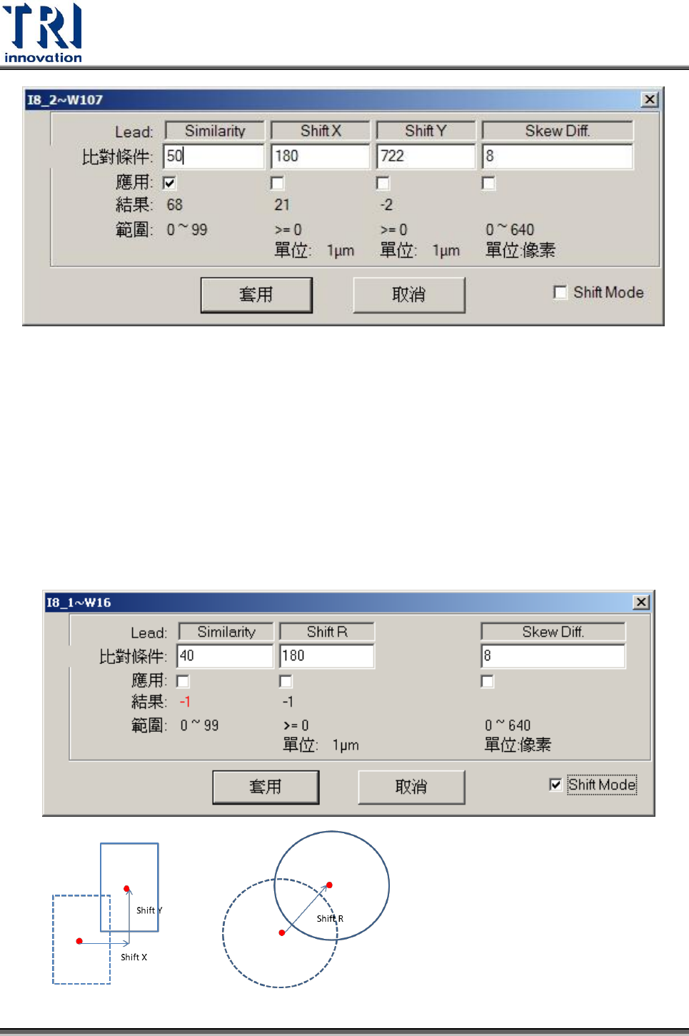 Test Resear ch Inc. TR 7500 Series User Guide – Soft ware 383 Similarity :待測影像與標準影像之相似度容許值。 Shift X :待測元件之 X 方向位移的容許值。 Shift Y :待測元件之 Y 方向位移的容許值。 Skew Difference :相鄰兩個 [Lead] 框之間的高低差的容許值 Shift Mode :以圓的方式來檢測並作為…